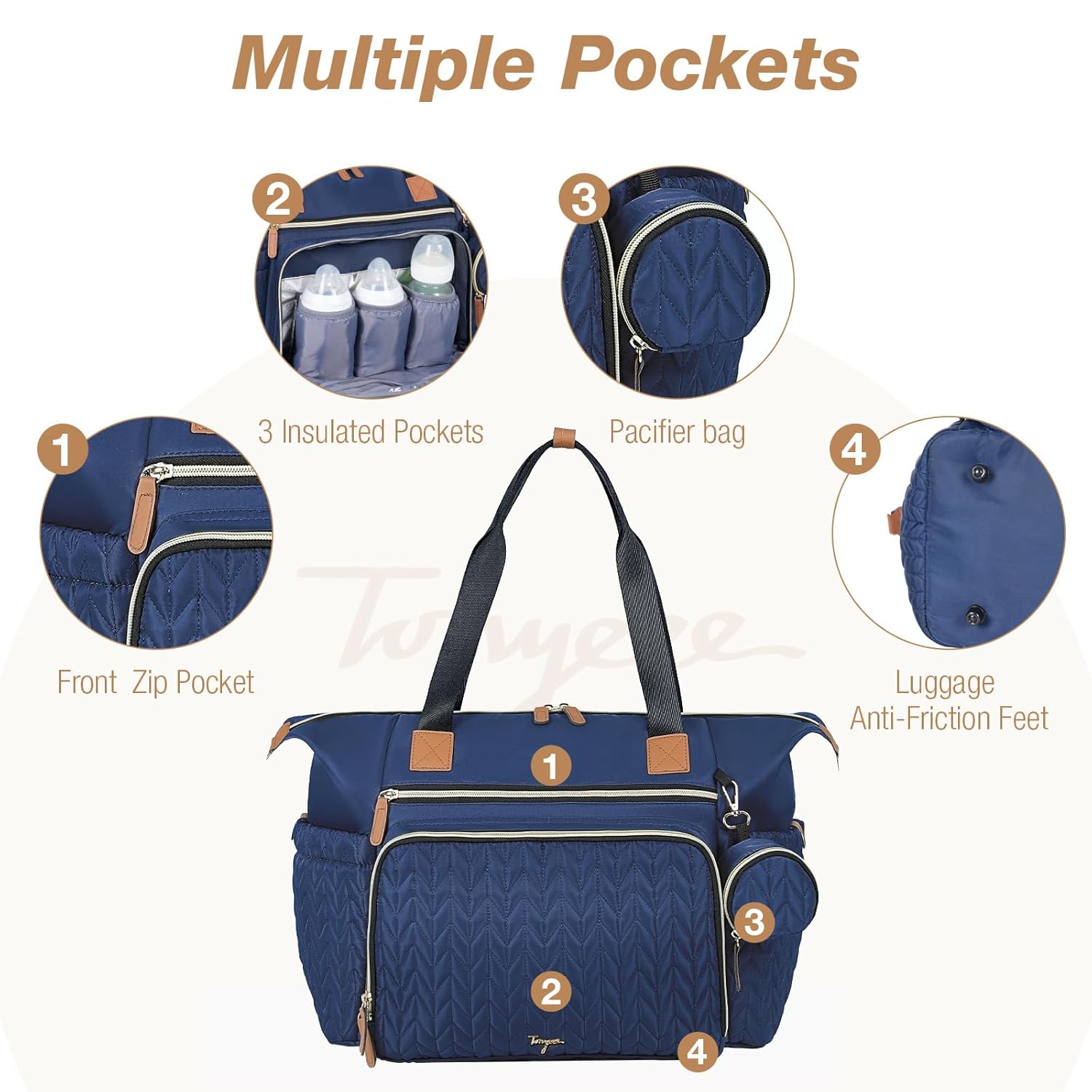 - Quilted Materials:Tonyeee diaper bag with 3D herringbone nylon quilting,achieve a perfect blend of practicality and fashion. While studded feet in the bottom keep the bag clean and off the ground