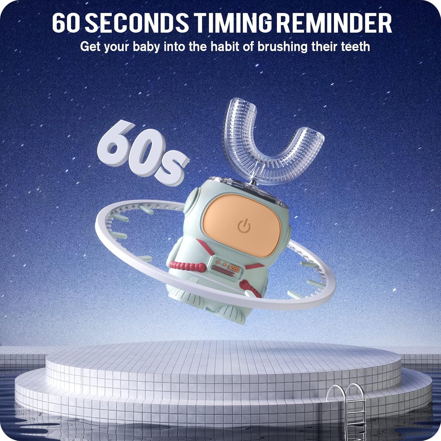 Ultrasonic Kid's U-Shaped Electric Toothbrush, IPX7 Waterproof, Five Cleaning Modes, 60S Smart Reminder (Cartoon Astronaut, Green Ages 2-6)