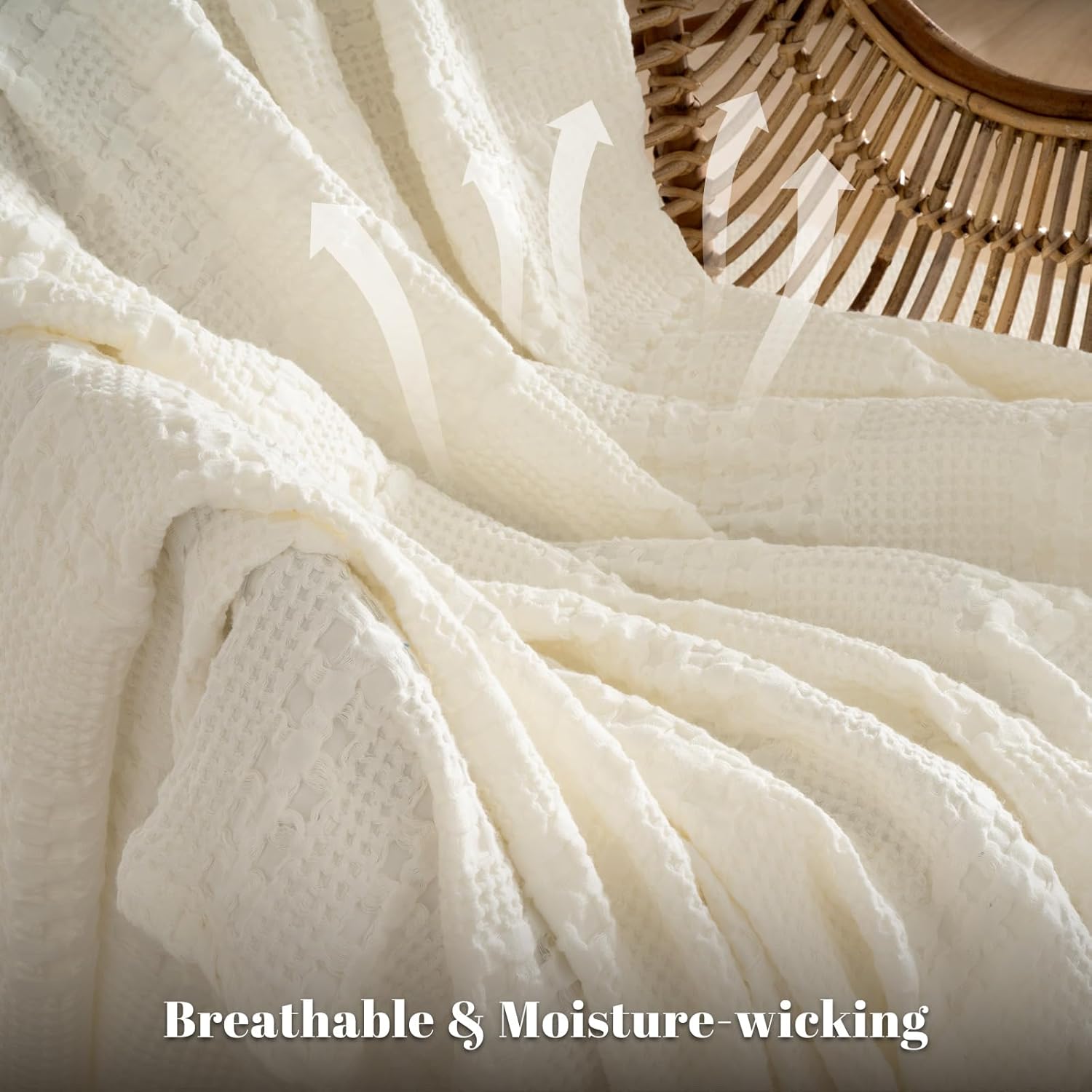 PHF 100% Cotton Waffle Weave Blanket Twin Size, Soft Lightweight Breathable Cozy Summer Blankets for Bed, Luxury Aesthetic Woven Bedding for Home Decor, 66"x90", Ivory