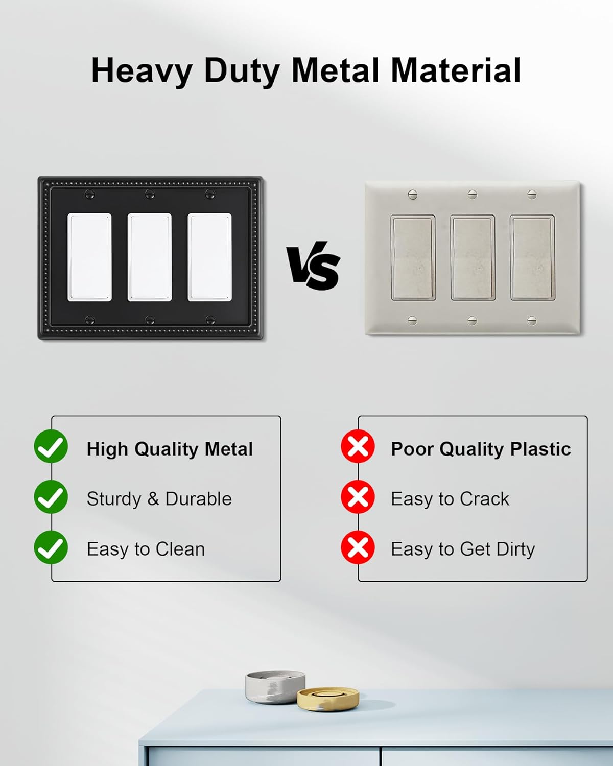 - Timelessly Elegant - The tripple decorator outlet covers feature an exquisite black finish with a traditionally styled beaded border. Offering a functional yet elegant enhancement to your home decor. Stylish wallplate effortlessly blends practicality with a refined decorative accent and sophisticated charm.