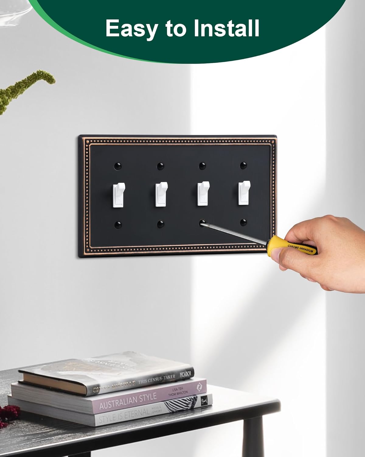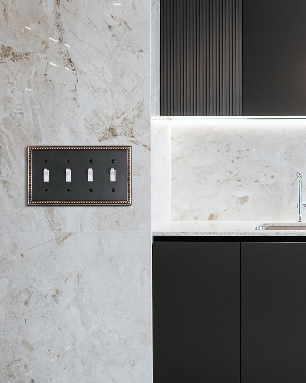 - Timelessly Elegant - The quad light switch plate covers feature an exquisite aged bronze finish with a traditionally styled beaded border. Offering a functional yet elegant enhancement to your home decor. Stylish wallplate effortlessly blends practicality with a refined decorative accent and sophisticated charm.