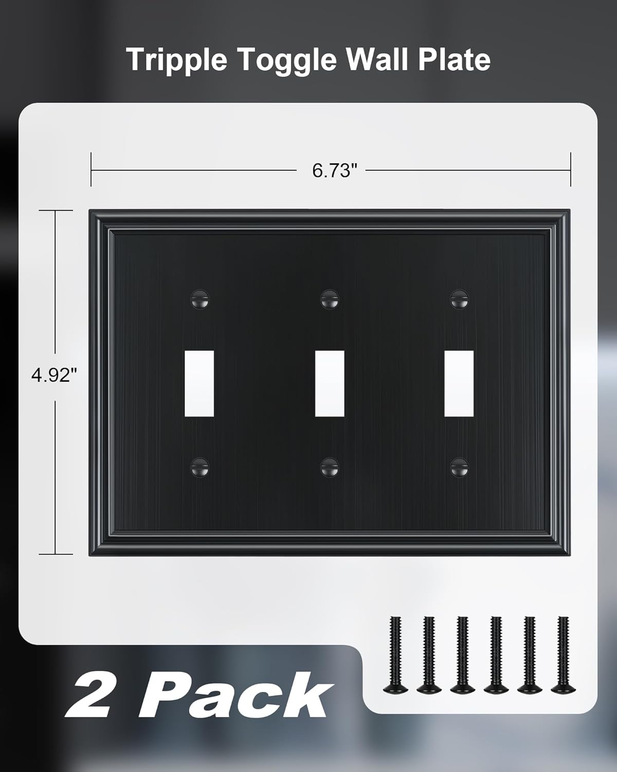 - Specification - Pack of 2 triple toggle metal wall plates, size at 6.73''W*4.92''H. Easy replacement of any wall plate with the same configuration, making it a convenient choice for remodeling or upgrading your home. Backed by a one-year warranty to ensure your peace of mind and complete satisfaction.