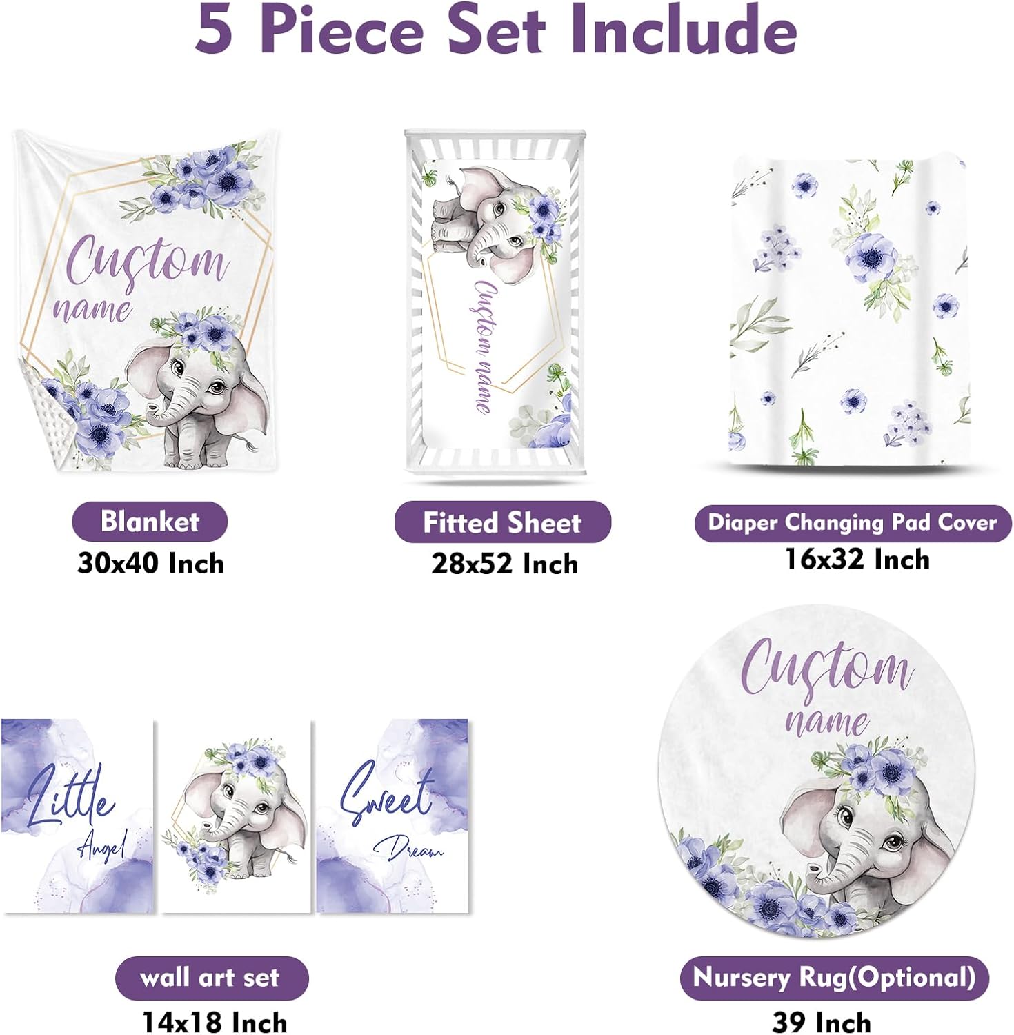 Personalized Baby Crib Bedding Set for Baby Girls, Purple Flower Pattern Elephant Theme Custom Name Baby Crib Sets 5-Pcs, Toddler Double Layer Blanket Fitted Sheets Changing Pad Cover Rug Wall Art Set