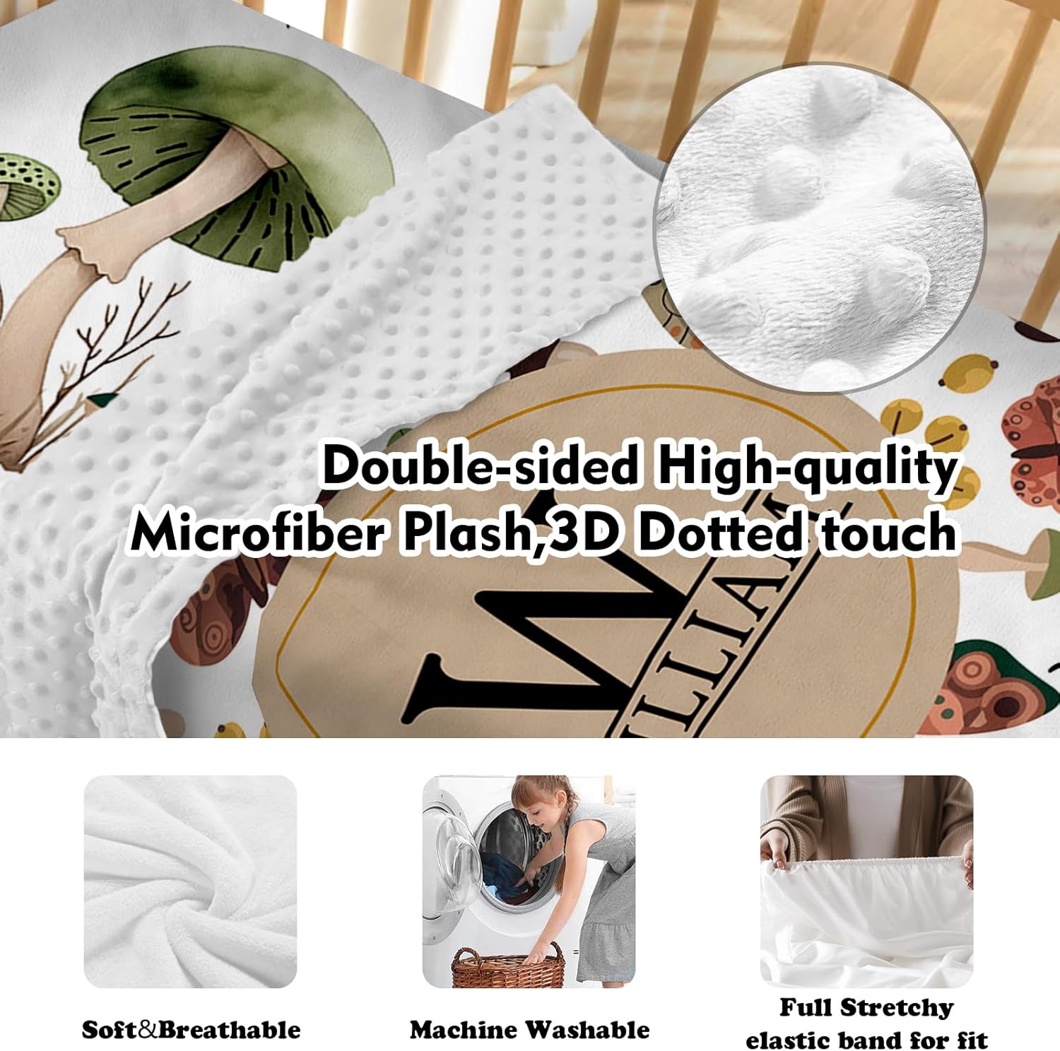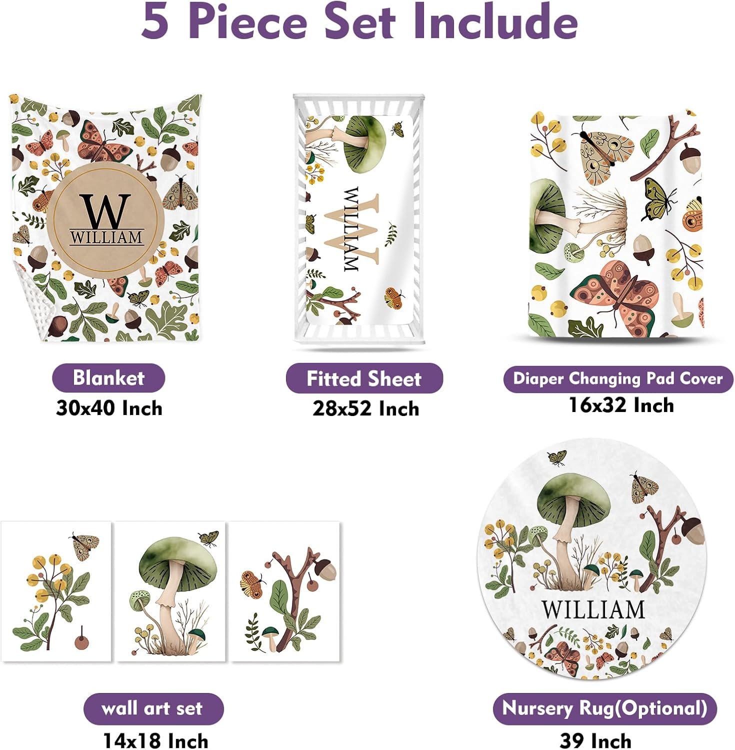 Personalized Baby Crib Bedding Set for Baby Boys Girls, Mushroom Design Custom Name Baby Crib Sets 5-Pcs, Toddler Double Layer Blanket Fitted Sheets Changing Pad Cover Rug Wall Art Set