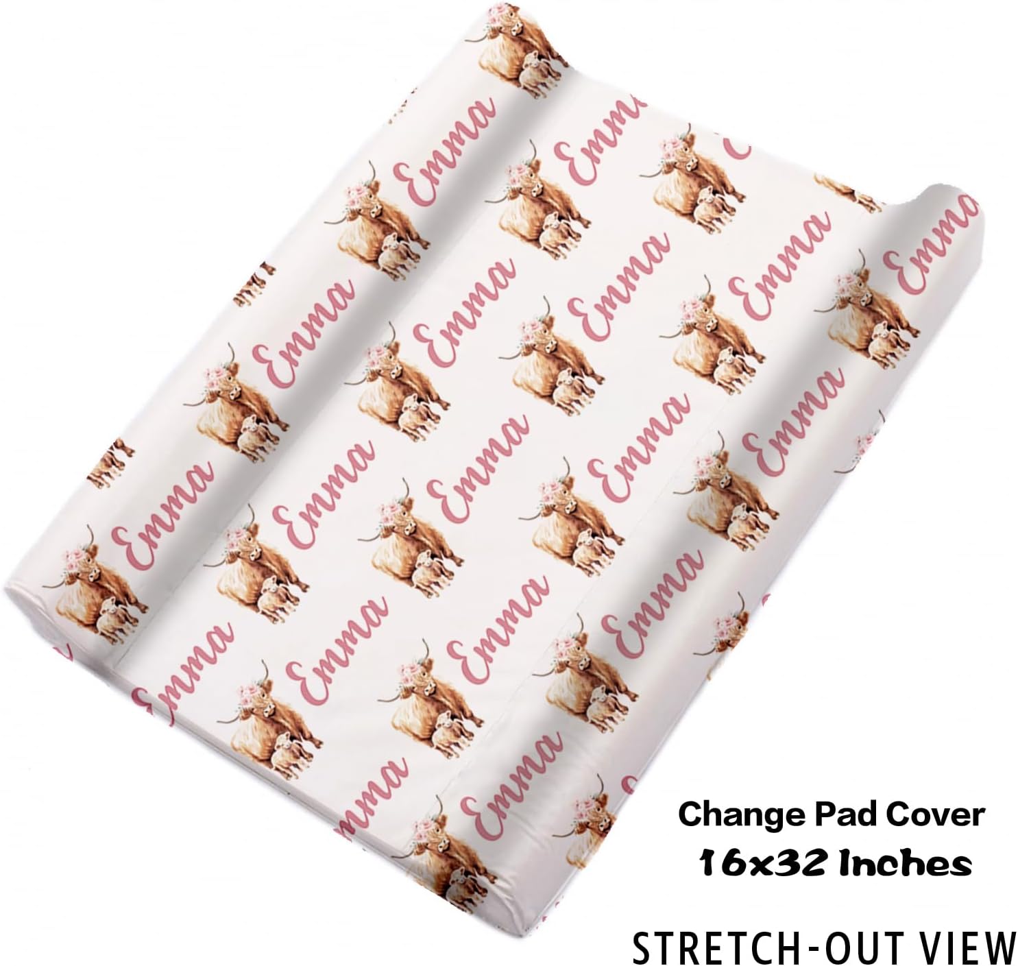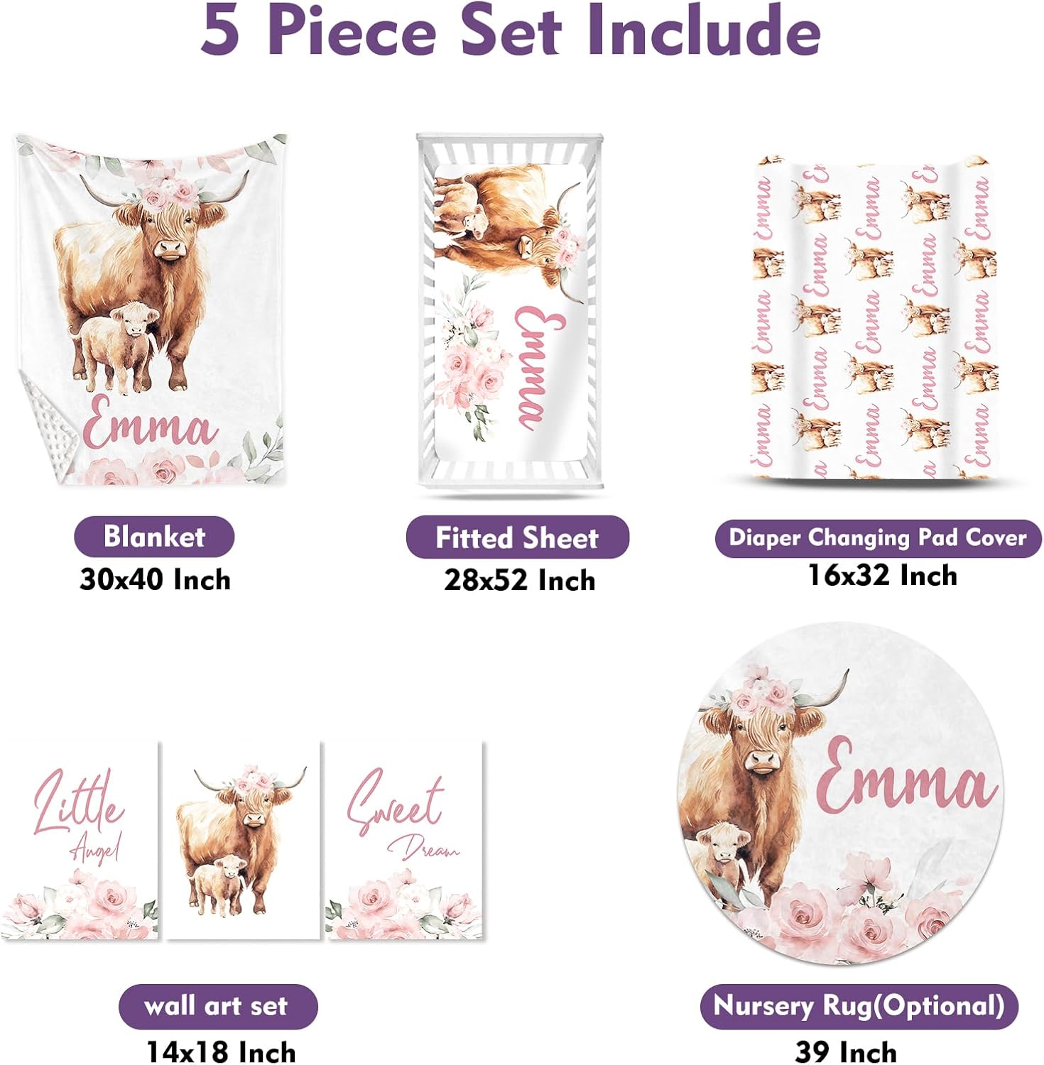 Personalized Baby Crib Bedding Set for Baby Girls, Pink Highland Cow Pattern Custom Name Baby Crib Sets 5-Pcs, Toddler Double Layer Blanket Fitted Sheets Changing Pad Cover Rug Wall Art Set