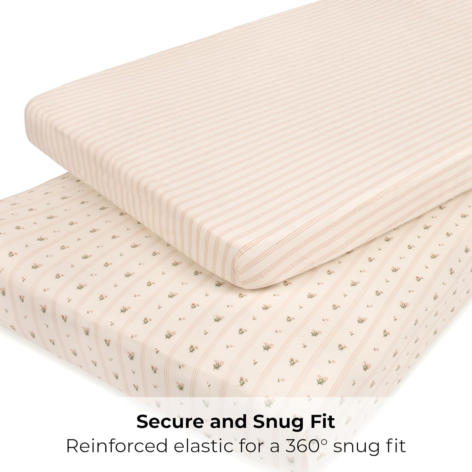Ely's & Co. Pack and Play Sheets, for Mini/Portable Crib, 2 Pack Fitted Playpen Play Yard Sheet Set Compatible with Graco Pack n Play, for Baby Girls, 100% Cotton, 38”x24”x5” Pink Linear Floral
