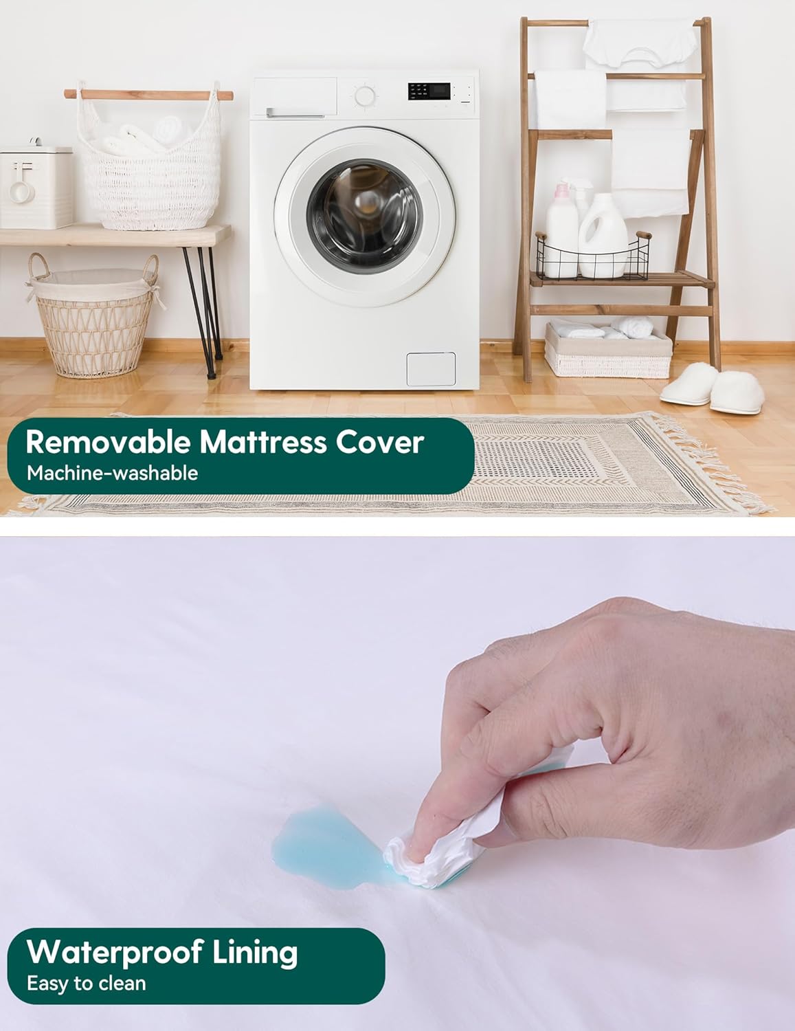 - ăEasy to CleanăThe zipper mattress cover is easily removable and machine washable, while the waterproof inner lining makes cleaning up any messes or accidents a breeze