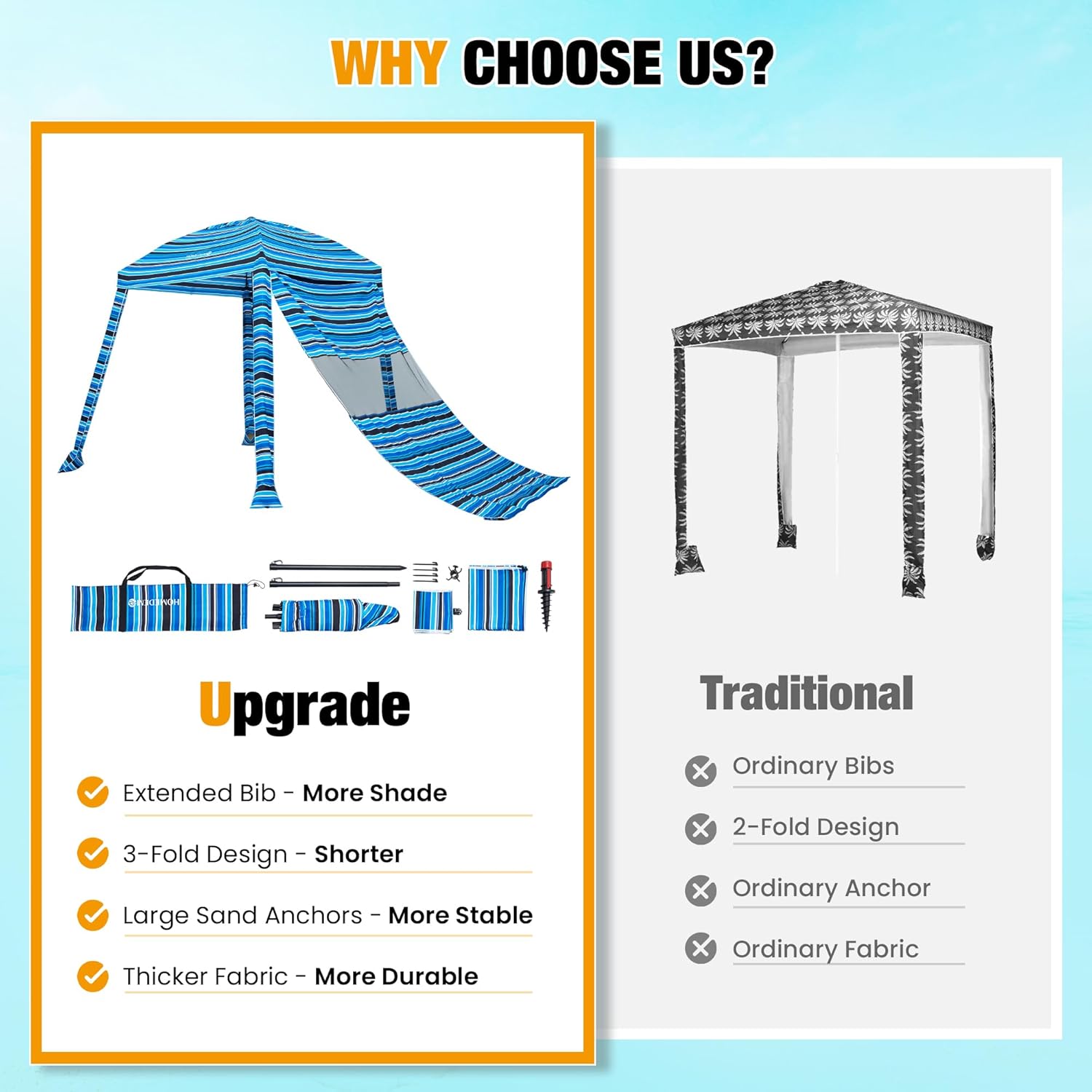 - Durable & Stable: Beach canopy for sand made of durable polyester fabric that is not afraid of stretching and tearing, it can still recover after long use. Frame adopts thicken rods, which are safer, more durable and rust-free, the beach tent is equipped with 4 ground pegs and windproof ropes. The beach shade canopy will stand up to average wind at any angle.