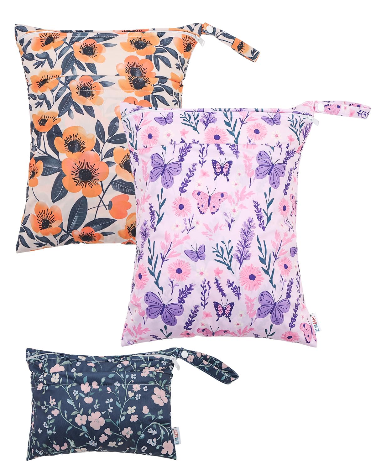 ALVABABY 3 Cloth Diaper Wet Dry Bags Waterproof Reusable with Two Zippered Pockets Travel Beach Pool Daycare Soiled Baby Items Yoga Gym Bag for Swimsuits or Wet Clothes Small medium Large 3L-SML08