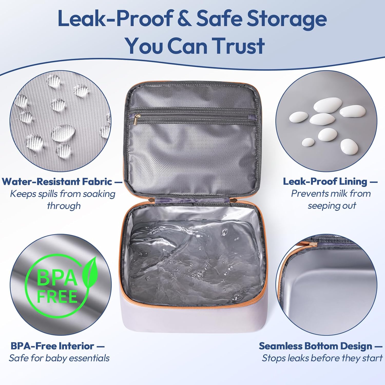 - Leakproof & Insulated: Crafted with a high-quality polyester outer layer, this breast pump bag is durable, dust-resistant. The seamless bottom that prevents leaks from seeping out, keeping your pump accessories and personal items dry. The food-contact grade PEVA lining and included ice packs, it keeps milk or snacks fresh for up to 12 hours — ideal for work, travel, or daycare