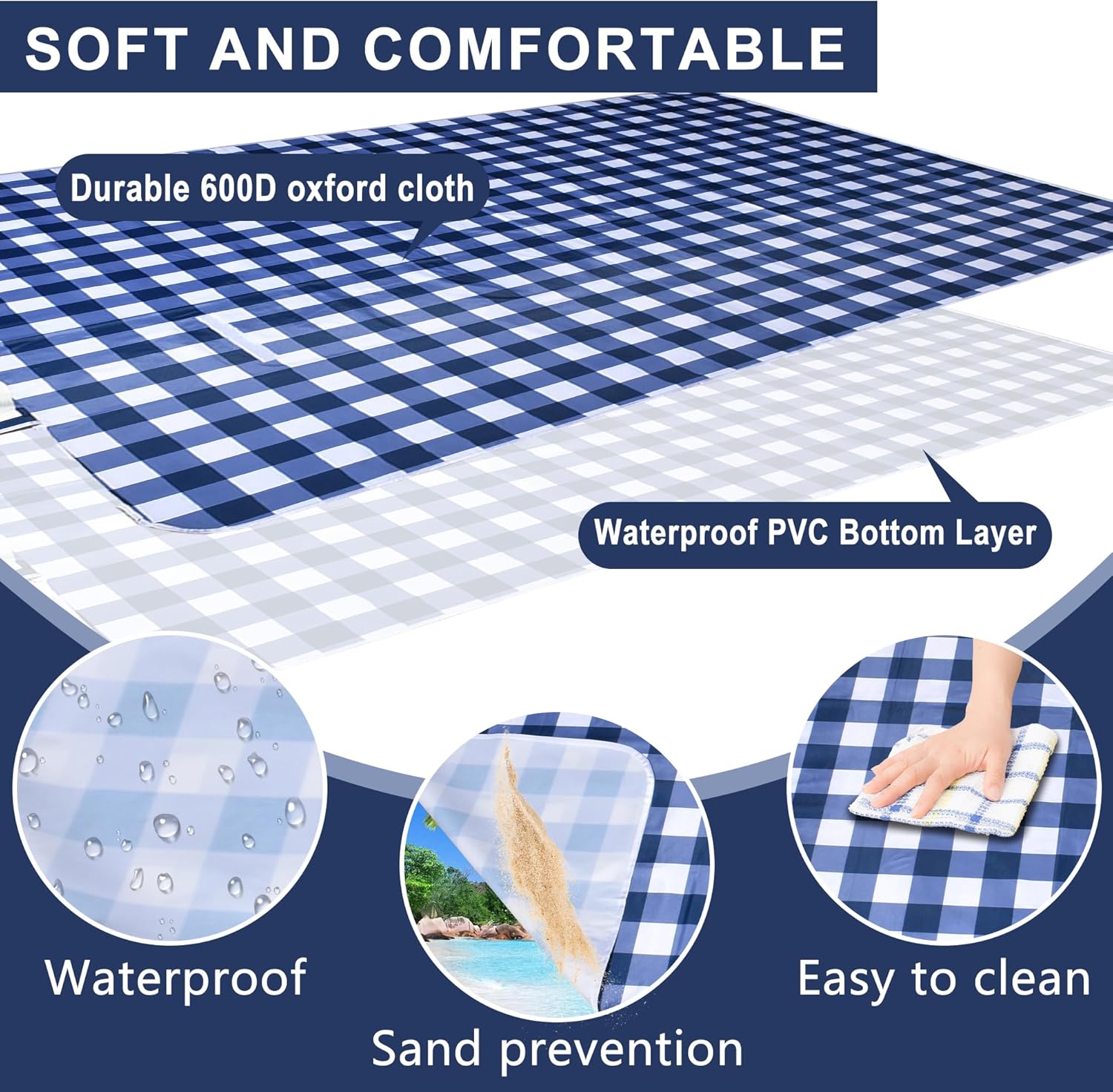 80"x60" Waterproof Sandproof Picnic Mat - Portable Foldable Outdoor Blanket for Beach, Park, Travel & Indoor Use - Lightweight Compact Design, Easy-Carry (Blue&White)