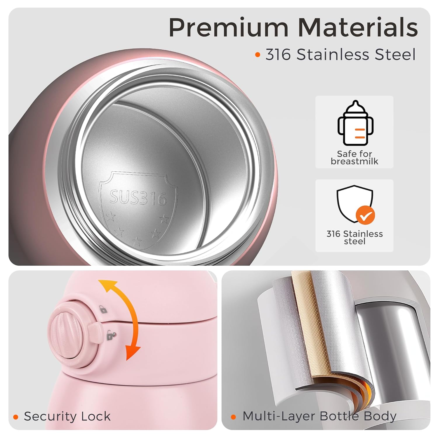 - Safe Materials & Mom-Friendly Design: Crafted from food-grade silicone accessories and 316 stainless steel. The secure safety lock and leak-proof plug prevent spills, ensuring peace of mind during travel. Portable baby bottle warmer includes a sponge brush to make cleaning effortless, helping you keep the bottle clean with ease