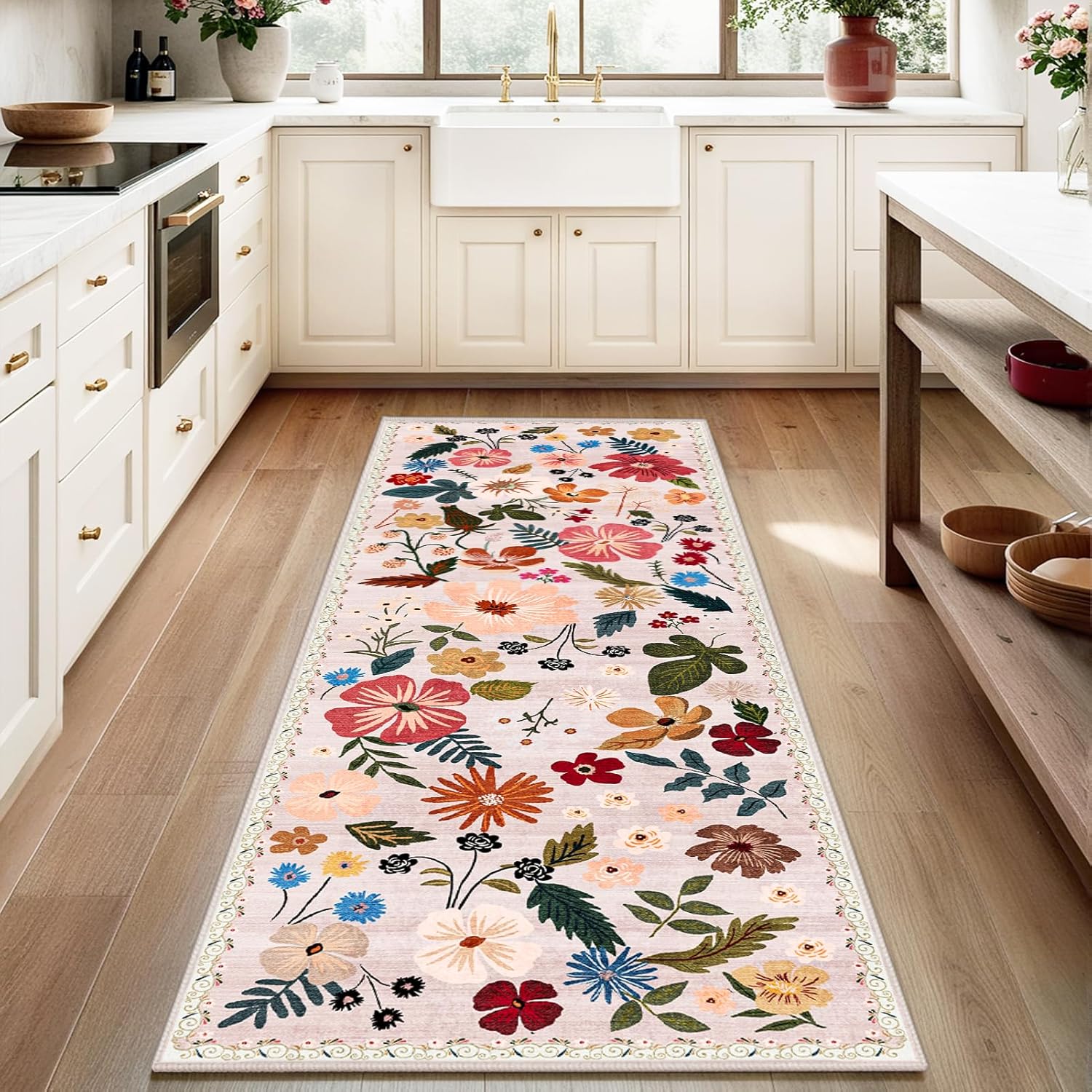 2x6 Runner Rugs for Hallways Non Slip with Rubber Backing Stain Resistant Area Rug Washable Beige Boho Floral Ultra-Thin Carpet Rugs Indoor for Entryway Kitchen Bedroom Laundry Bathroom Stairwell
