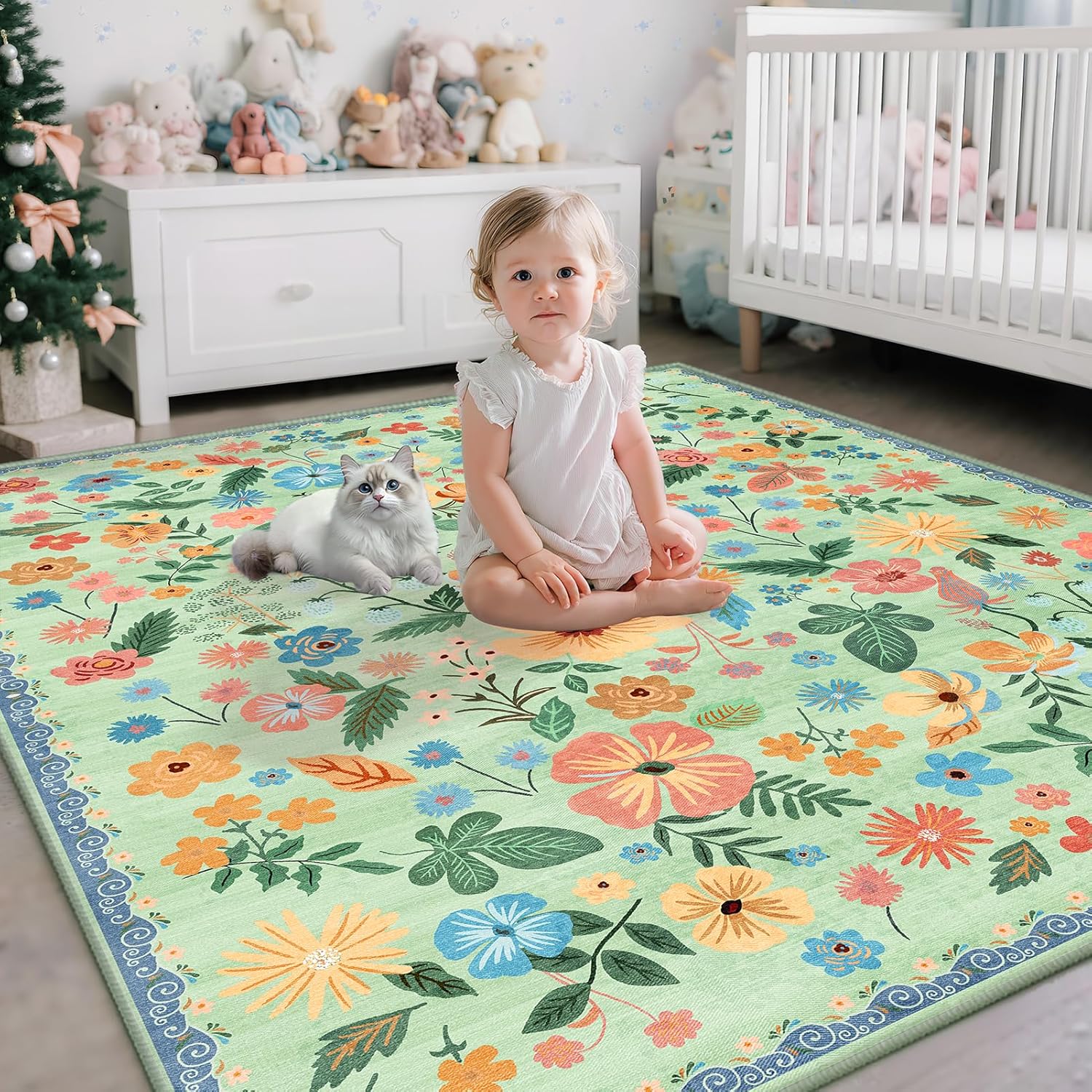 3x5 Rug for Living Room Washable Non Slip with Rubber Backing Soft Faux Fur Low Pile Stain Resistant Small Area Rug 3x5 Boho Vintage Floral Carpet Rug for Bedroom Kitchen Entrance,Green