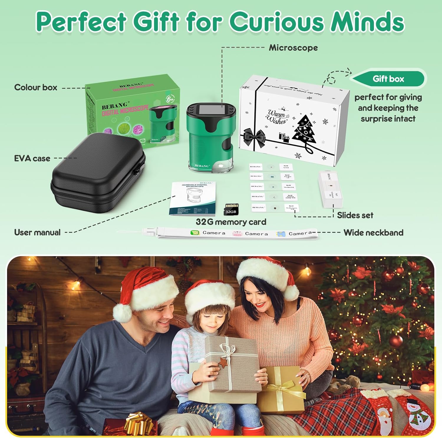 1000X Handheld Microscope for Kids 4K 2.0" Screen Rechargeable Mini Pocket Digital Microscopes w/Slides Kit Portable Edu Gift Age 4-6 8-12 Children Students (Green)