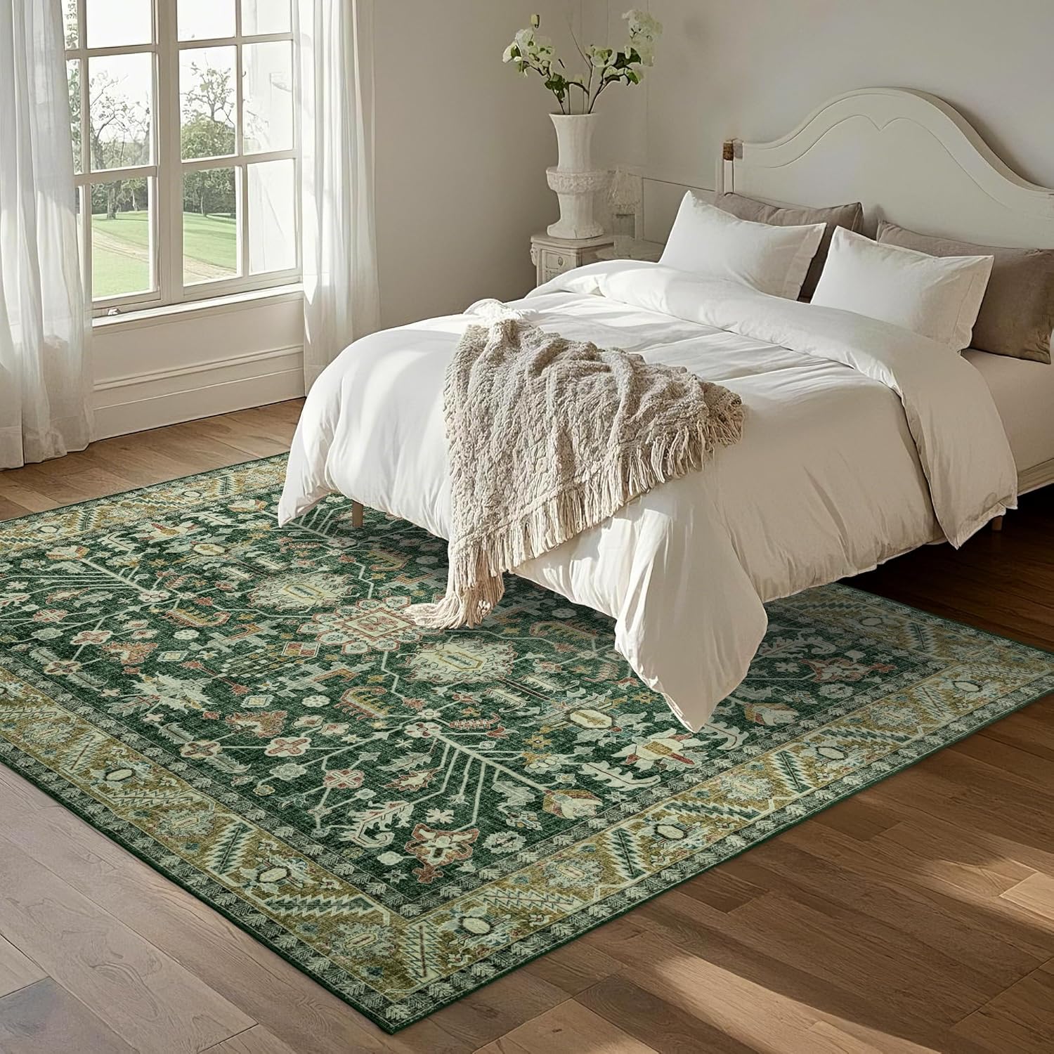 6x9 Area Rugs Washable: Oriental Soft Area Rug for Living Room Bedroom No Shedding - Low Pile Thin Carpet Rug for Dining Room Non Slip - Boho Vintage Rug for Home Decor - Retro Forest Green
