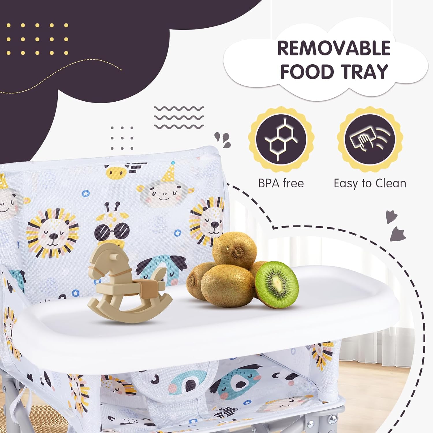- Gender Neutral Design : includes snap safety harness, BPA free tray, and safety straps for attaching to adult chair; rated for ages 6-36 months up to 33 pounds