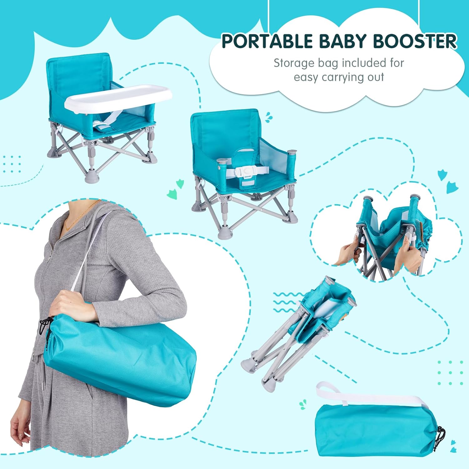 - Compact Camping Seat :Lightweight frame toddler booster seat folds to 5 x 15 inches, into included carry bag, making it an excellent travel baby booster seat for beach lawn dining out