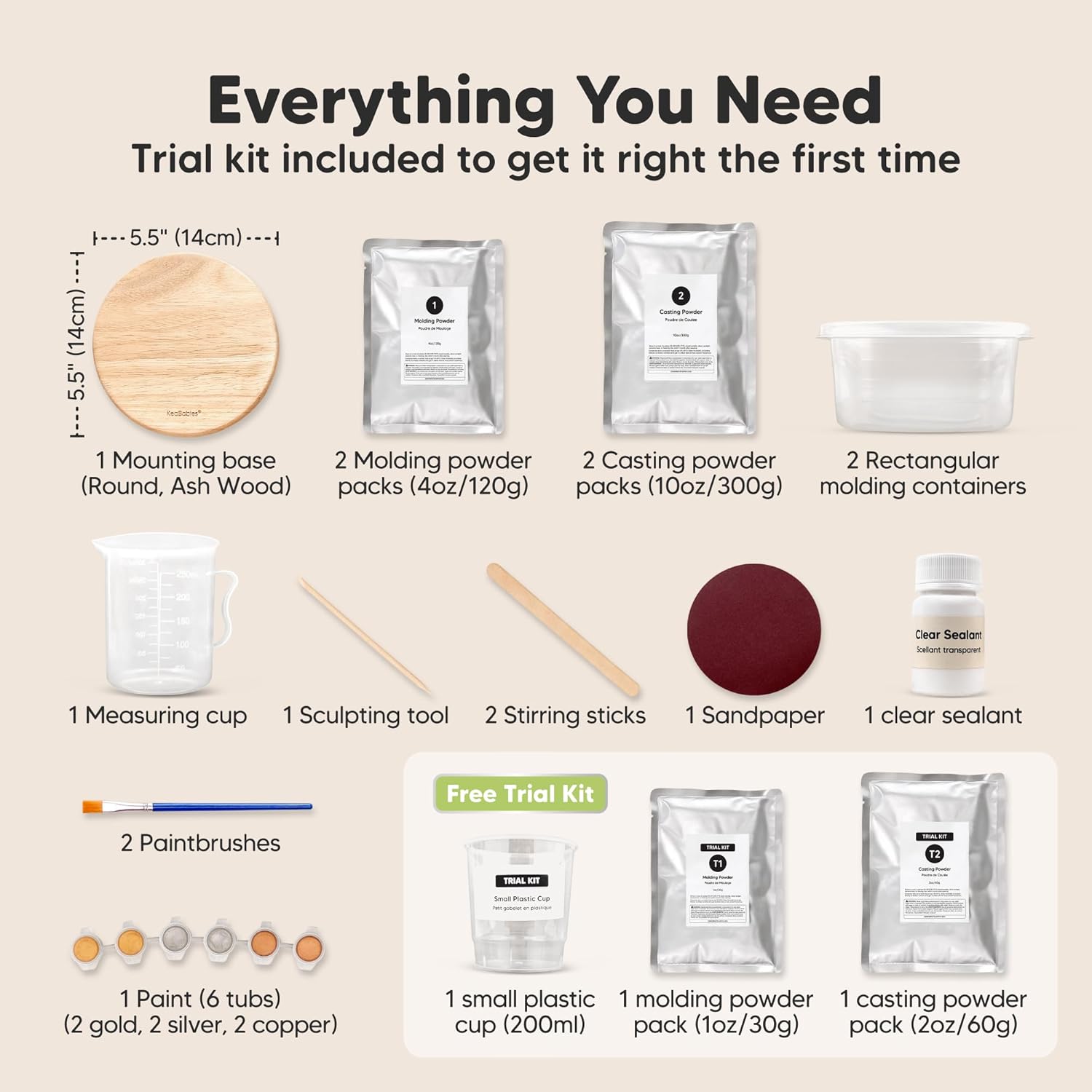 - All-in-1 – Our baby molding kit has all you need to personalized 2 castings. Includes a trial kit, 2 molding & casting powder pack, display base, sealant, 2 molding containers, stirring sticks, colored paint, brushes, sculpting tool, and sandpaper.