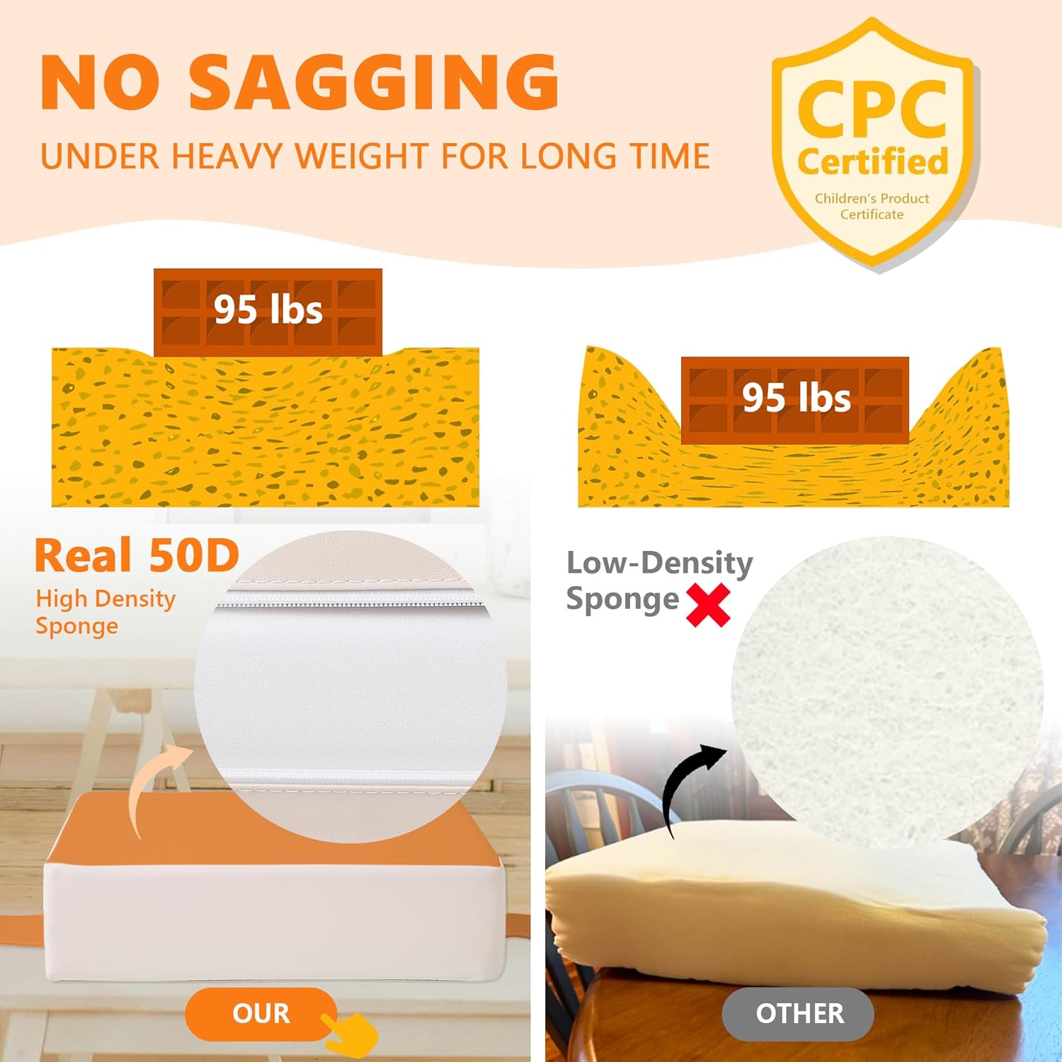 - 【Stain-Proof & Easy To Clean】The cover of this booster seat is crafted with PU leather material, which effectively acts as a barrier against stains. Whether it's spills from drinks or food, you won't have to worry about them seeping into the sponge. Moreover, cleaning this seat is a breeze. Just a quick wipe with a damp cloth and it's as good as new. This makes maintaining the seat's cleanliness effortless and saves you precious time and effort.