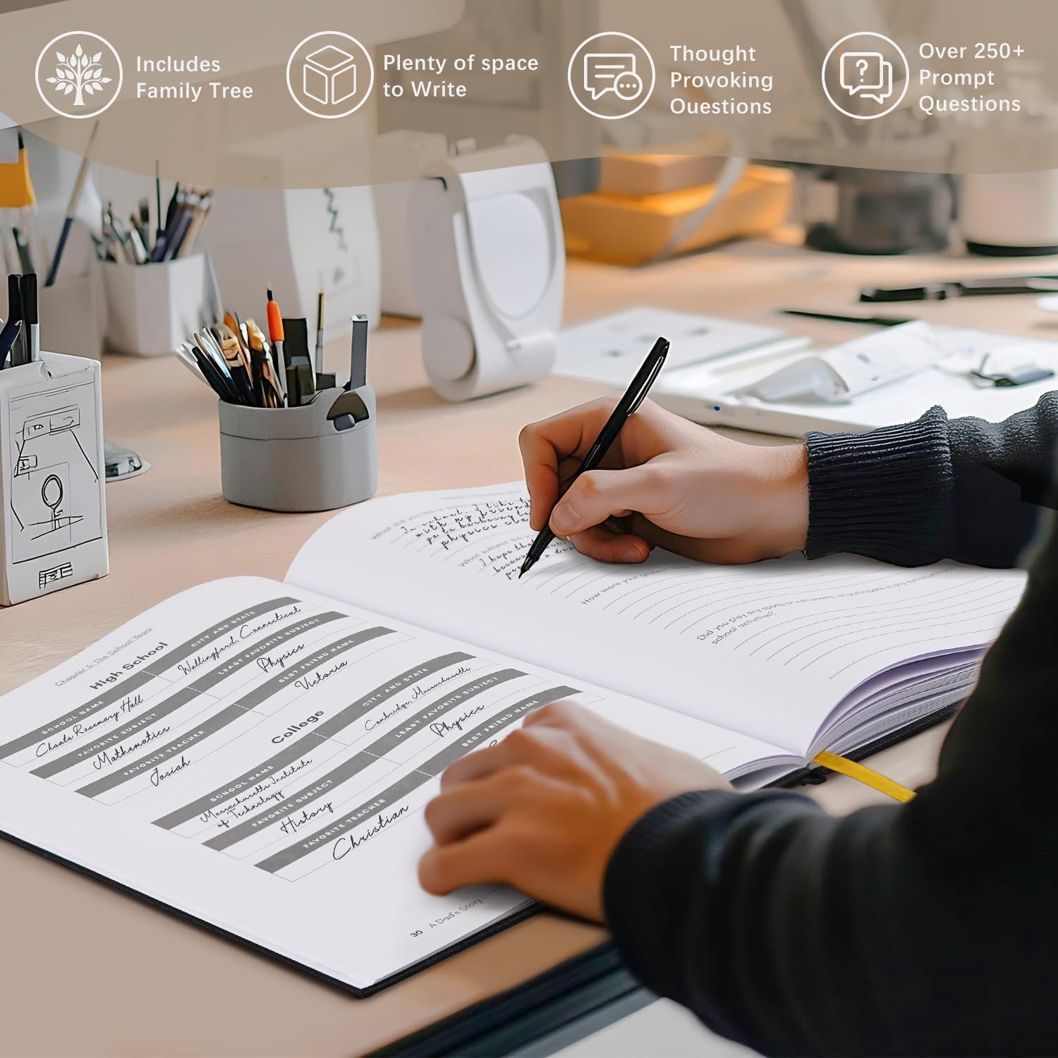 - Include 1 guided journal book with prompts questions, it's a perfect gift idea for dad. There are more than 250 fun questions to fill out, and these questions are carefully designed to help a dad share his memories and tell his life story in his own way.