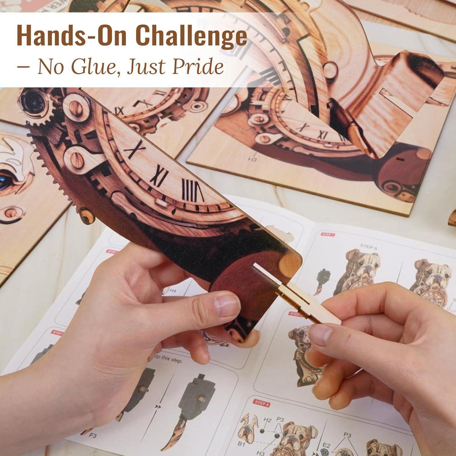 - 【Dog-Themed Mechanical Clock】This 3D puzzle clock crafted for DIY craft enthusiasts and dog lovers alike, this bulldog-designed 3D puzzle merges creativity with engineering. It features a swinging tail pendulum, offering a satisfying challenge for puzzles adult builders.