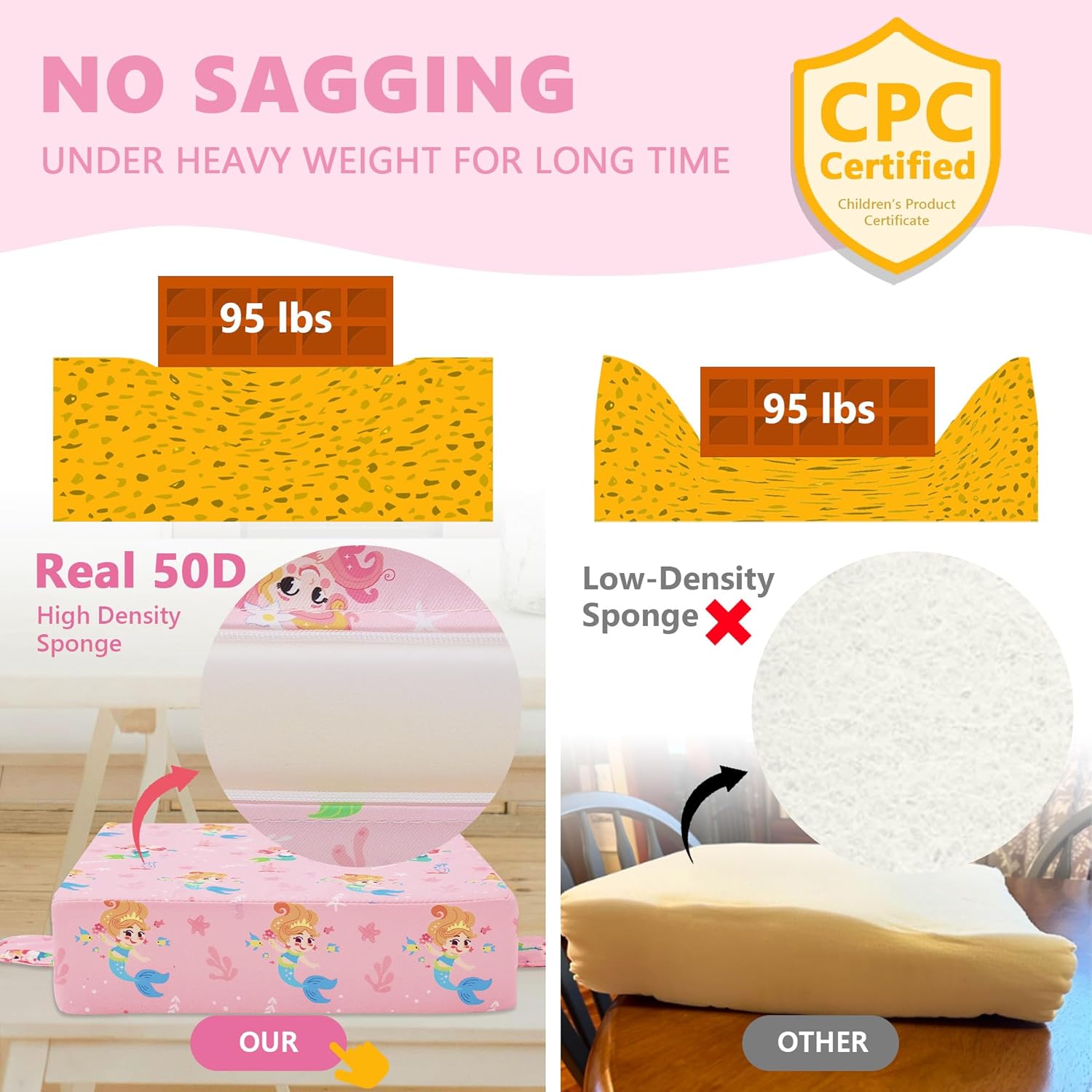 - 【REAL 50D Sponge, ZERO Sagging】The Booster Seat from Sylynvia Brand is of REAL 50D high-density sponge, which ensures softness and comfort while being able to withstand a weight of 80 pounds and will not sag when sitting for a long time, providing excellent support.This means that it has a long service life and your baby can use it from the age of 1 to 8 years old.