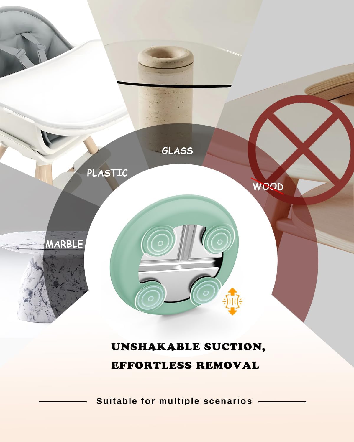 - Innovative Design: This baby plate with suction combines durable 304 stainless steel with a silicone suction base featuring 4 strong, non-slip suction cups. Keeps plates in place on highchair trays or tables, helping your child self-feed and minimizing mealtime mess. Say goodbye to flipped toddler plates and hello to free hands for mom!