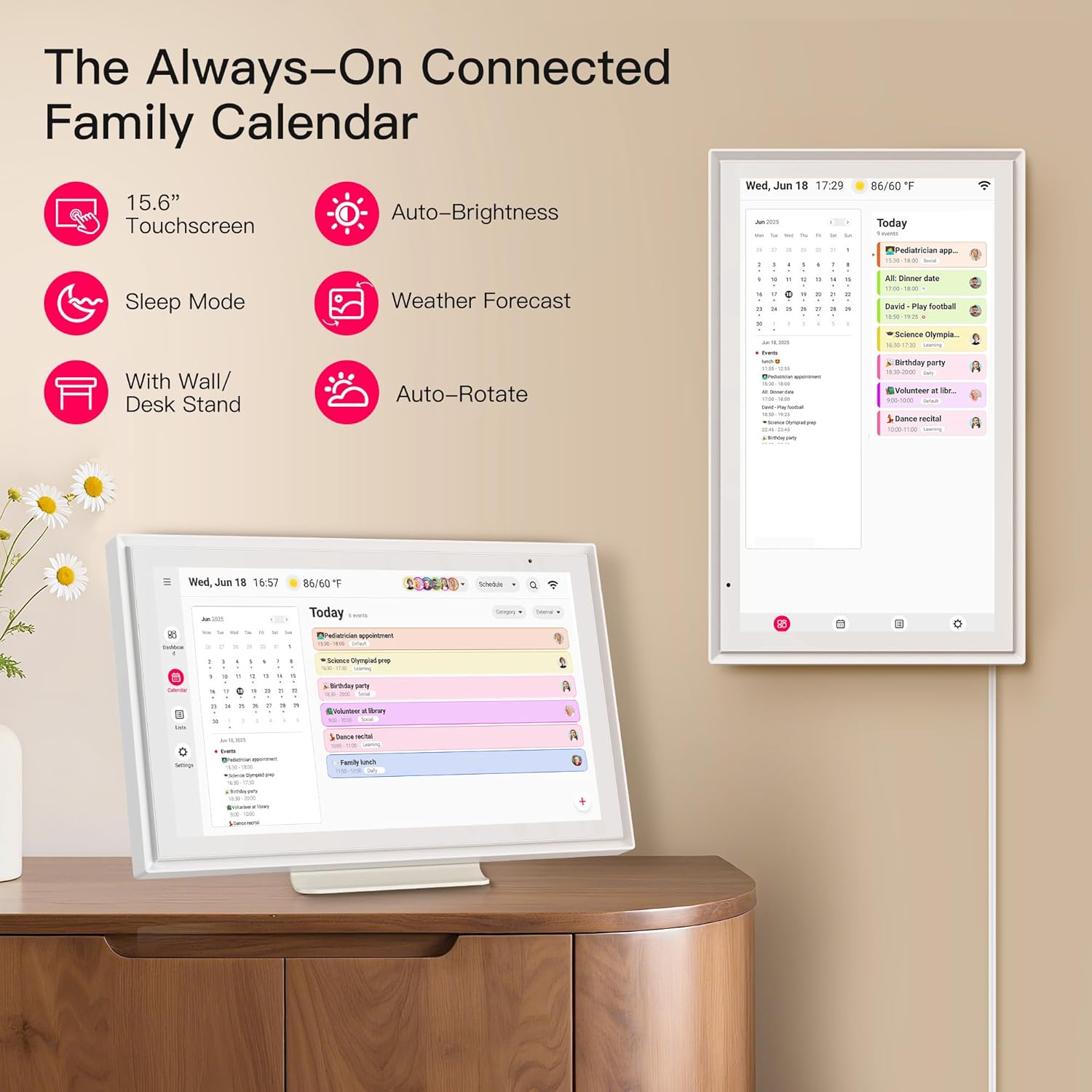 15.6 Inch Digital Calendar, Full HD Touchscreen Smart Planner for Family Schedules - Wall & Desk Mount, Great for Seamless Daily Planning & Household Organization, with LED Reminder Light