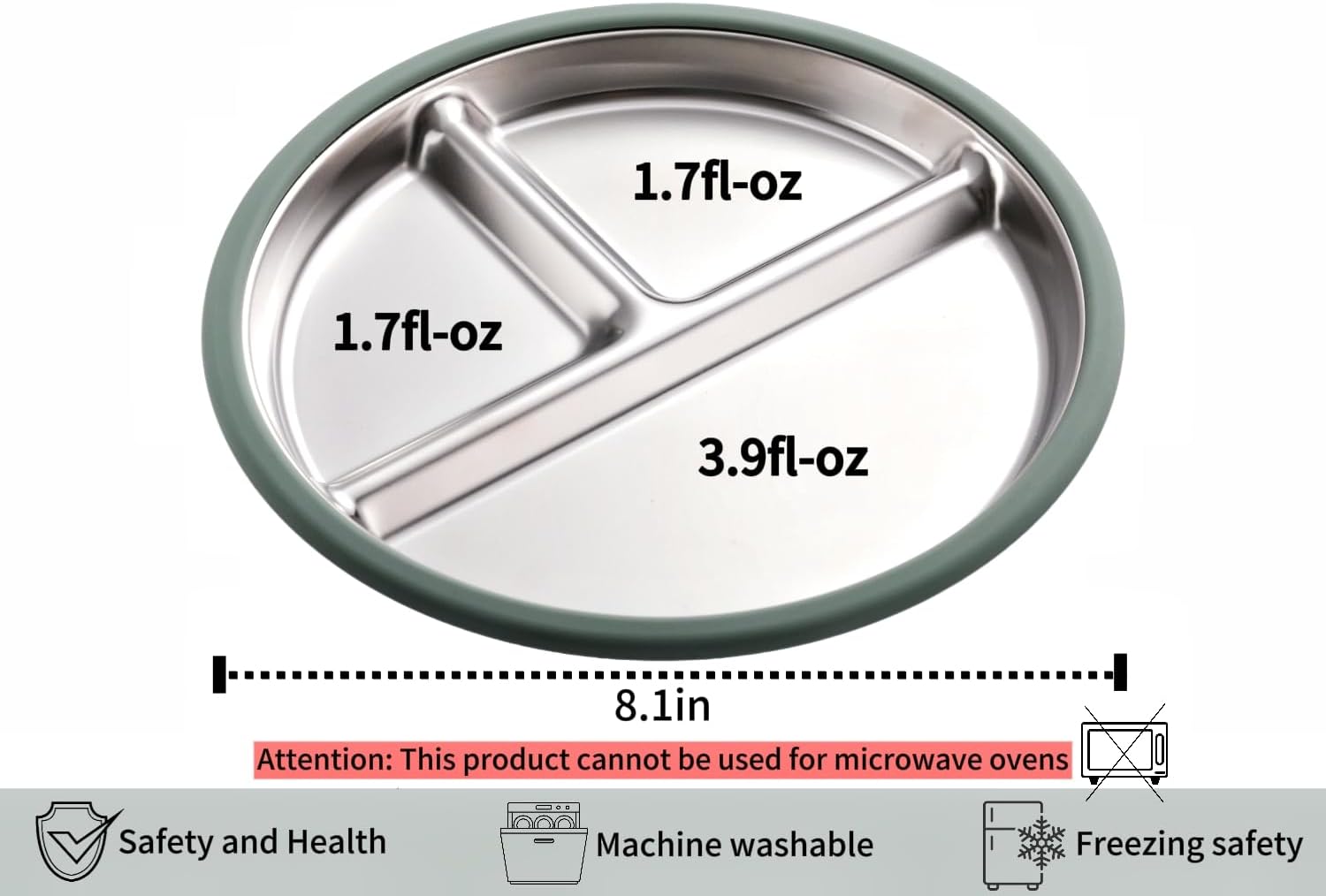 - 【Portable Size】This stainless steel kids plate with suction size is 8.1 * 8.1 * 0.67in, Package includes 3 baby plate, available volume of plate is 1.7fl-oz/1.7fl-oz/3.9fl-oz.