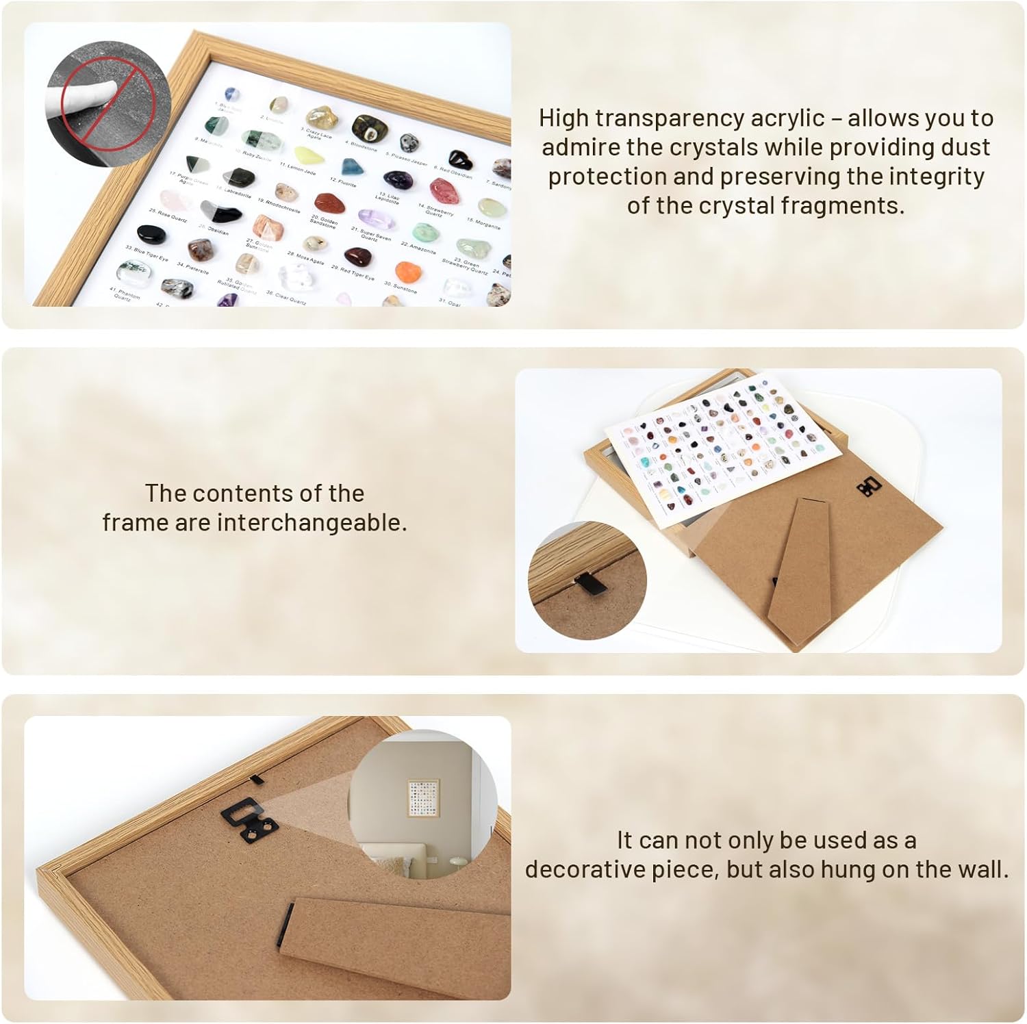- EXQUISITE DISPLAY AND DIVERSE CRYSTAL SELECTION-----Height: 26.8cm, Length: 21.5cm, Width: 2.8cm. This ornament features 80 carefully selected natural crystal chips, each chosen for its vibrant color and unique shape. The crystals are neatly arranged in a high-quality frame, showcasing their natural beauty. The variety of crystals adds an artistic touch to any home or office space, highlighting the beauty and uniqueness of natural gemstones.