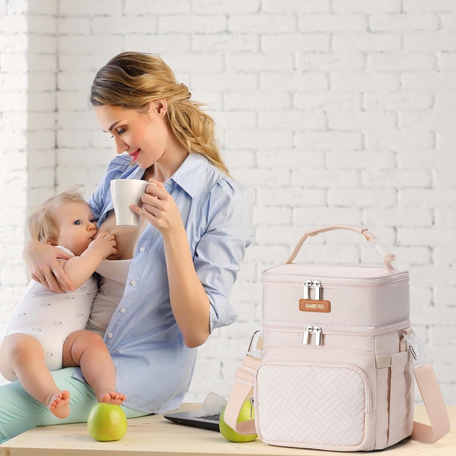 - Smart Double-Layer Organization & Versatile Use:Size of the breastmilk cooler bag is 9.2"D x 8.5"W x 11.2"H,maximize storage with dual compartments holding 6 bottles (9 oz each) and wearable pump or snacks. Perfect as a breastmilk cooler bag, daycare lunch box, or portable snack organizer. Keep essentials separated and secure for on-the-go convenience.