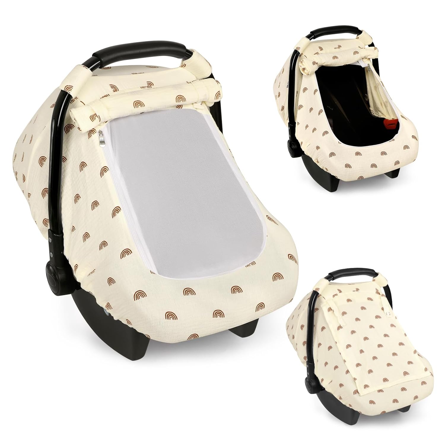 Hooyax Muslin Car Seat Cover Baby - Breathable and Privacy Car Seat Canopy with 3 Modes - Easy Install & Gift Box Packaging, Universal Fit for Infant Car Seats, Rainbow