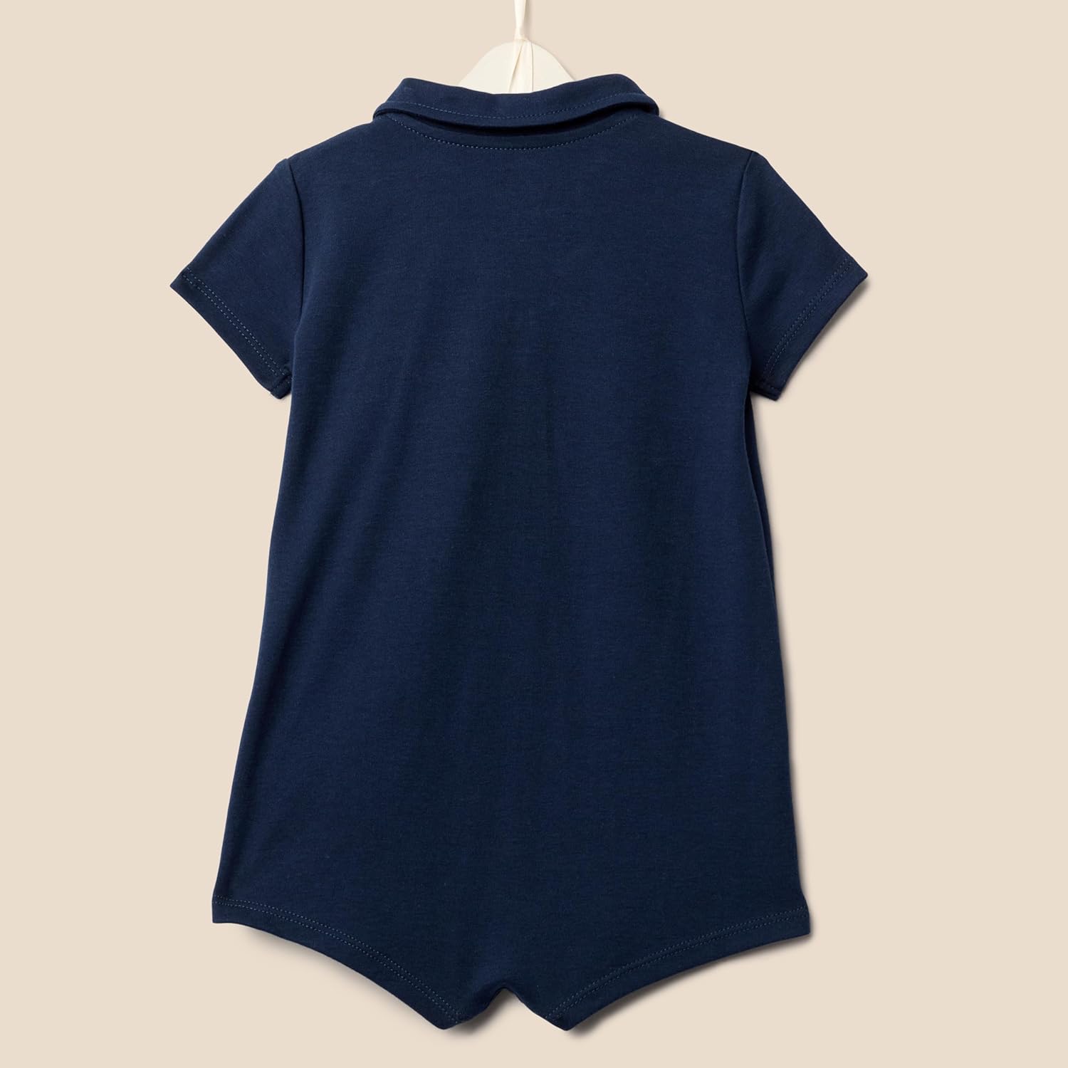 - DETAILS: Features a polo collar with a snap front placket and gusseted snap closure at leg opening