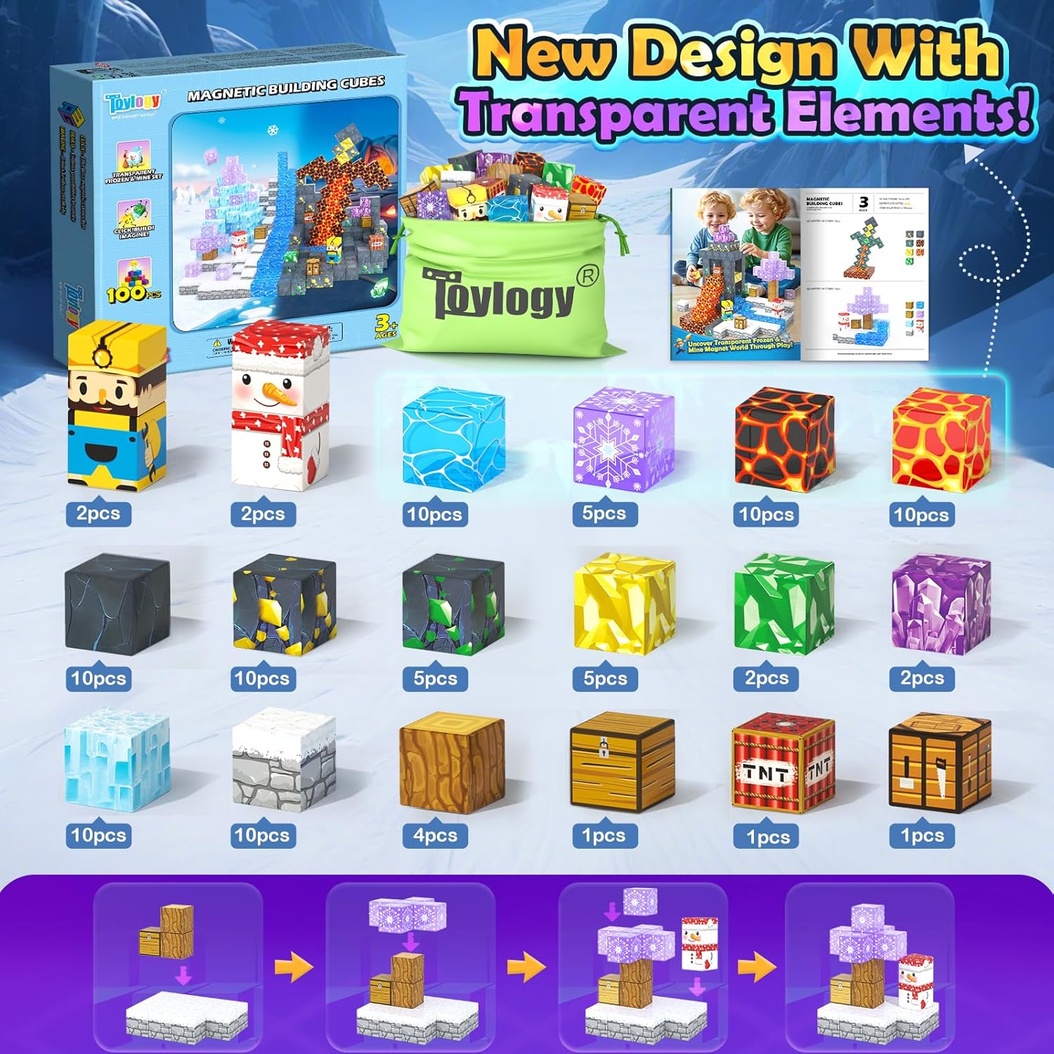 - 【EXPLORE MAGIC ICE CAVE & MINE MAGWORLD】Discover two enchanting worlds with Toylogy’s 100pcs magnetic blocks! Build icy caves with frosted snowflakes, flowing water, and clear, sparkling transparent magma rocks. Building blocks set sparks kids’imagination for kids ages 4-8, as they create bridges across ice lakes or build mine sword caverns. Join this exciting adventure - whether using magnetic tiles or magnetic game sets, perfect magnet toys for boys, girls, toddlers, and kids ages 3-12.