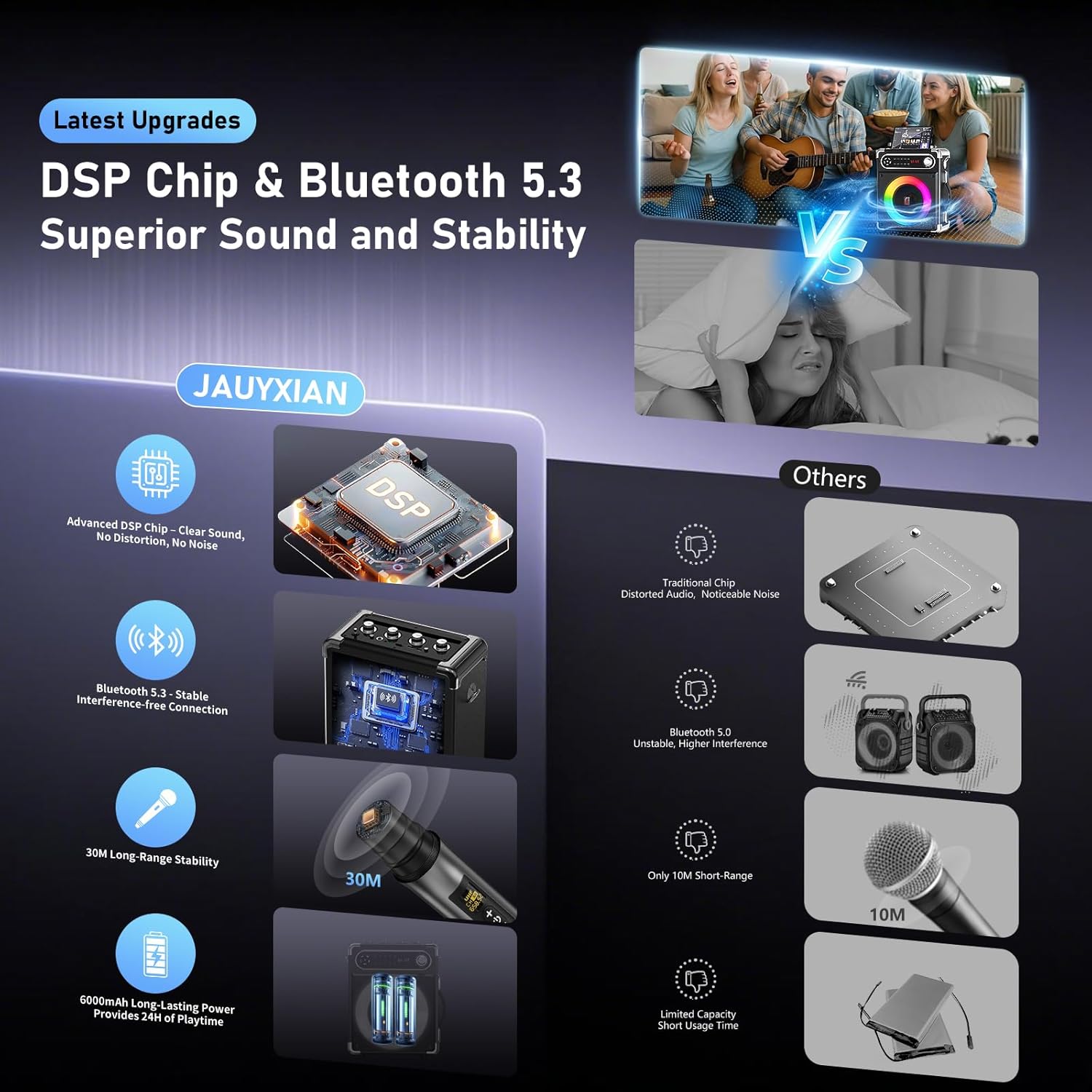 - 【Ultra-high-definition Stereo Sound Quality】: This Upgraded Karaoke Speaker is equipped with high-performance audio drivers and an advanced digital signal processor. Even at relatively high volumes, it can deliver clearer sound quality, more powerful bass, and balanced volume without distortion. The built-in 6.5" subwoofer and 2" tweeter can amplify your voice, play the radio, and stream music, providing you with a high-quality audio experience free of noise.
