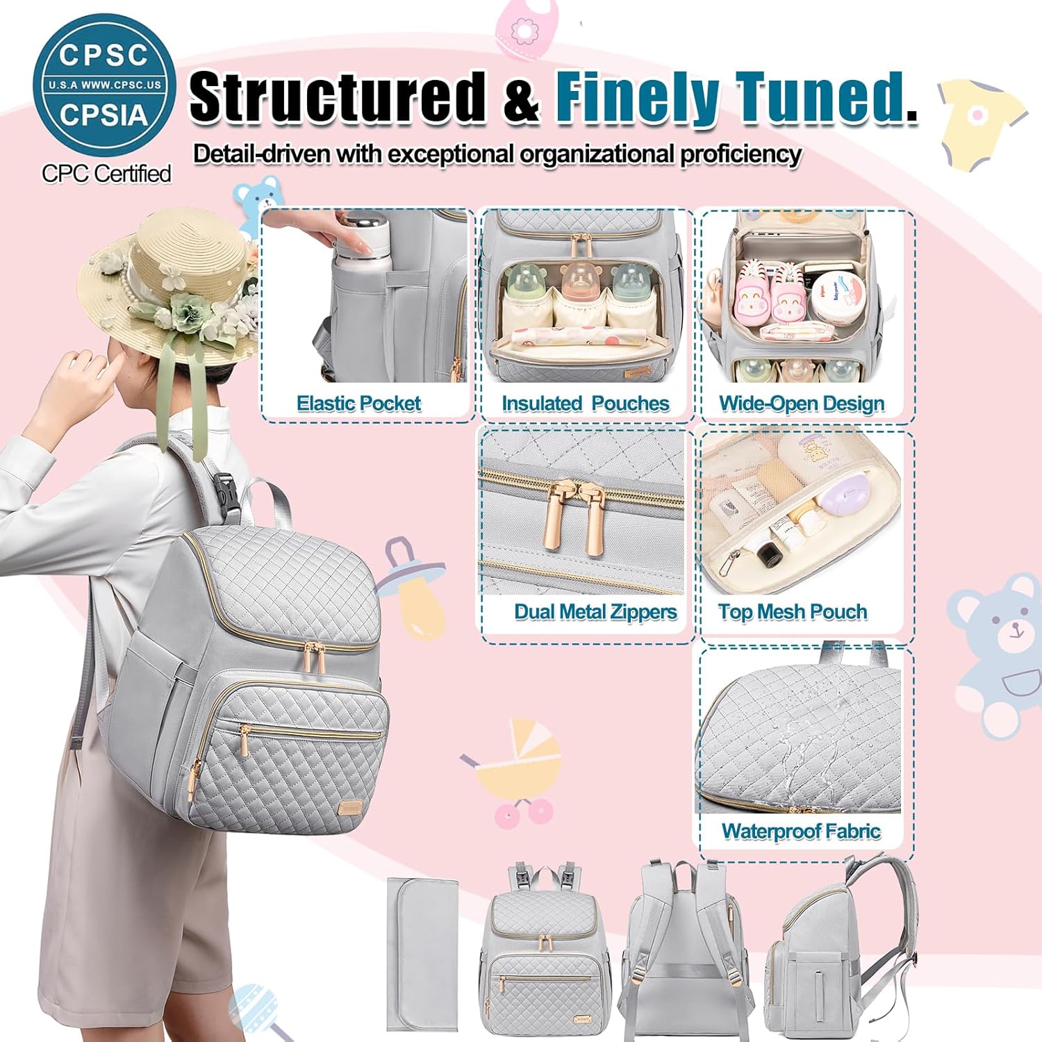 - 【Durable Build & Stylish baby bag】Baby diaper bag/ pañaleras para bebe With a sleek quilted design and gold-tone zippers, toddler diaper bag blends fashion and function. The high-quality polyster diaper bag exterior resists wear, while the waterproof nylon interior protects contents. Available in multiple colors, it’s a diaper bag essentials for moms who want practicality without sacrificing style.