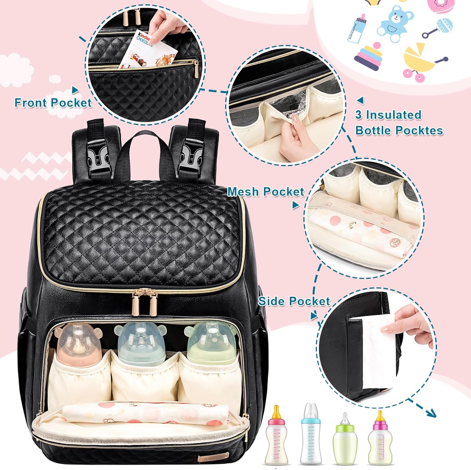 Weitars Diaper Bag Backpack Leather Baby Diaper Bag with Changing Pad Travel Diaper Backpack,Baby Bag for Mom,Stroller Straps,5 Insulated Pockets (Black Leather)