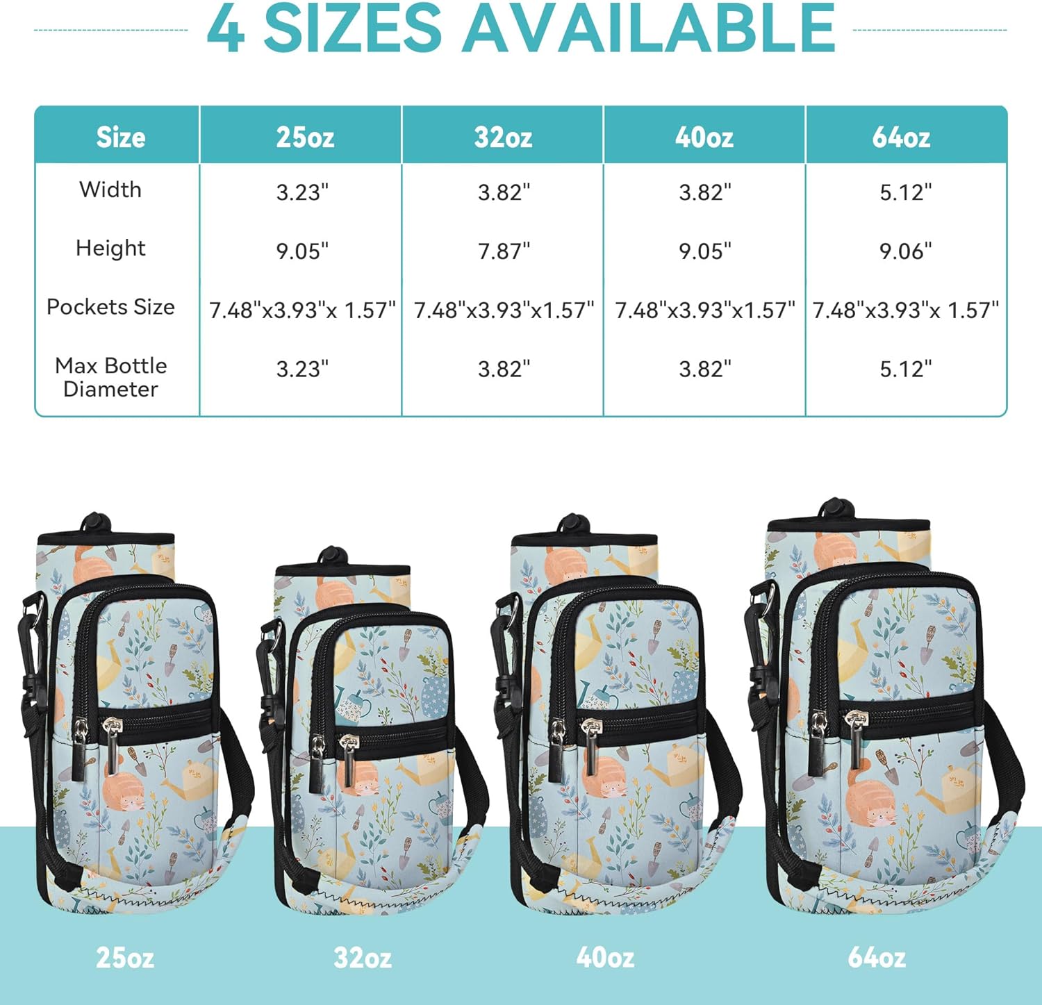 • 【Size】: Our AORTDES water bottle crossbody bag has 4 sizes to choose. 25oz (Max Bottle Diameter 8.2cm ≈ 3.23", Height 23cm ≈ 9.05", Pockets Size 7.48" x 3.93" x 1.57"). 32oz (Max Bottle Diameter 9.7cm ≈ 3.82", Height 20cm ≈ 7.87", Pockets Size 7.48" x 3.93" x 1.57"). 40oz (Max Bottle Diameter 9.7cm ≈ 3.82", Height 23cm ≈ 9.05", Pockets Size 7.48" x 3.93" x 1.57"). 64oz (Max Bottle Diameter 13cm ≈ 5.12", Height 23cm ≈ 9.05", Pockets Size 7.48" x 3.93" x 1.57").