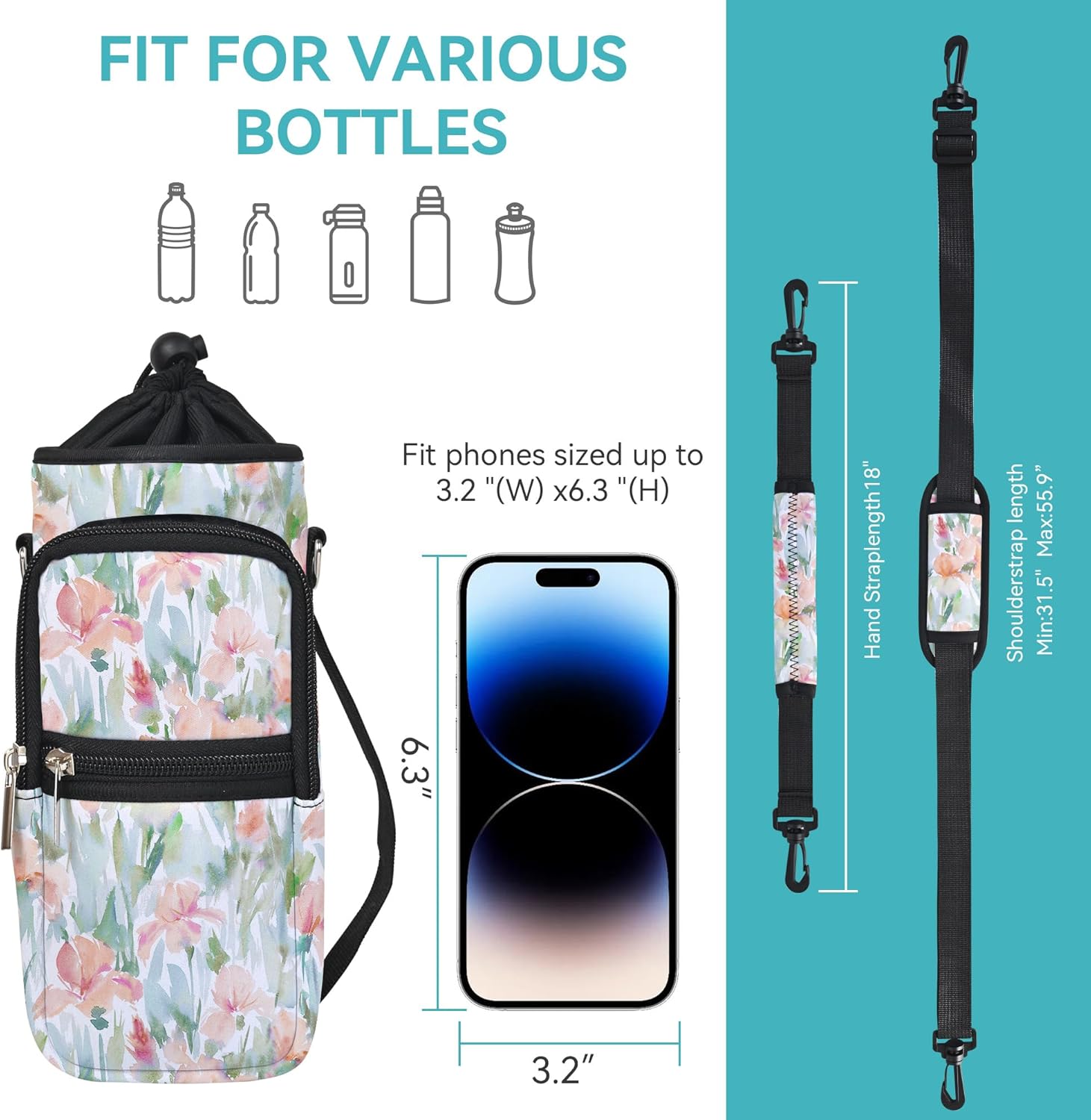 • 【Size】: Our AORTDES water bottle crossbody bag has 4 sizes to choose. 25oz (Max Bottle Diameter 8.2cm ≈ 3.23", Height 23cm ≈ 9.05", Pockets Size 7.48" x 3.93" x 1.57"). 32oz (Max Bottle Diameter 9.7cm ≈ 3.82", Height 20cm ≈ 7.87", Pockets Size 7.48" x 3.93" x 1.57"). 40oz (Max Bottle Diameter 9.7cm ≈ 3.82", Height 23cm ≈ 9.05", Pockets Size 7.48" x 3.93" x 1.57"). 64oz (Max Bottle Diameter 13cm ≈ 5.12", Height 23cm ≈ 9.05", Pockets Size 7.48" x 3.93" x 1.57").