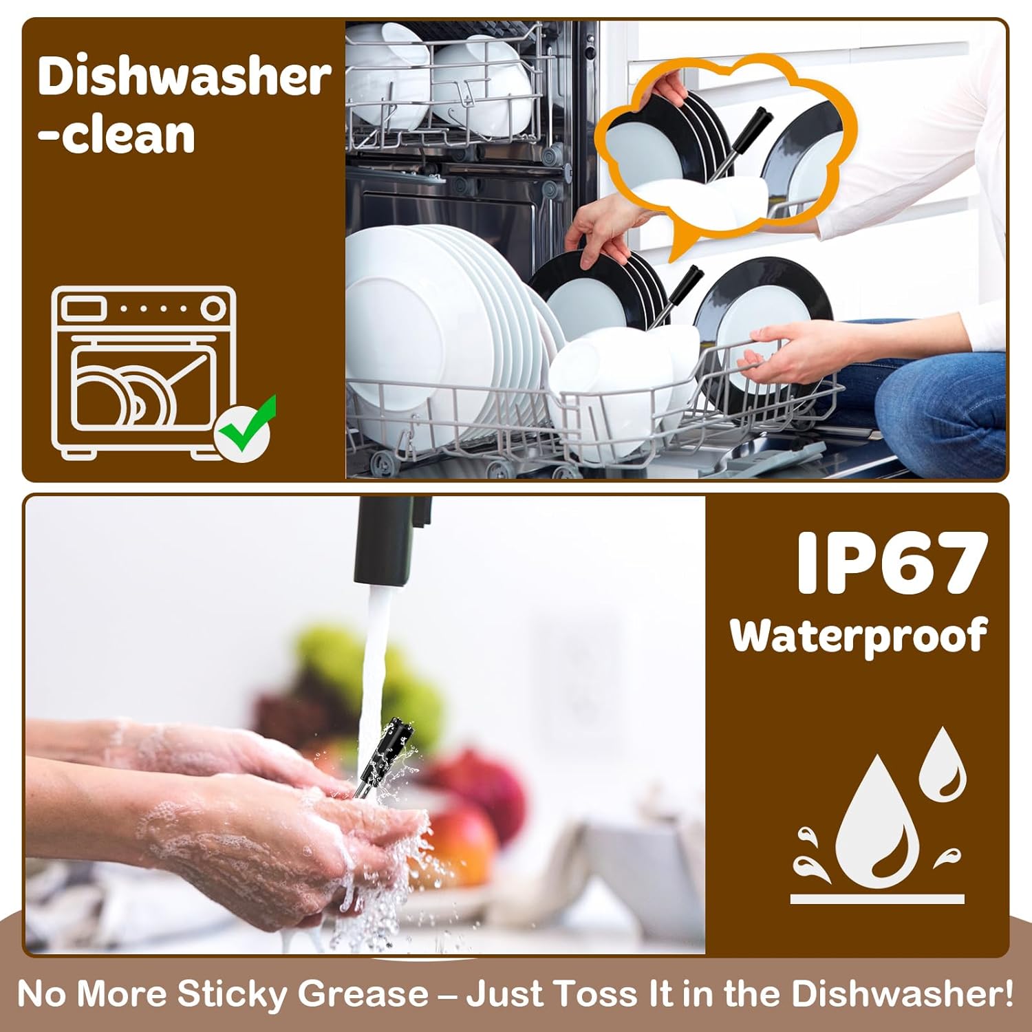 - High-Heat & Waterproof Probes: The stainless steel probes are engineered to withstand extreme temperatures up to 300°C (572°F), ideal for high-heat grilling and smoking. The thermometer for cooking can accurately monitor meat temperatures up to 100°C (212°F), with a precision of +/-1°C. The IP67 waterproof rating means that the probe can be rinsed under running water or cleaned using a dishwasher, ensuring durability and hygiene