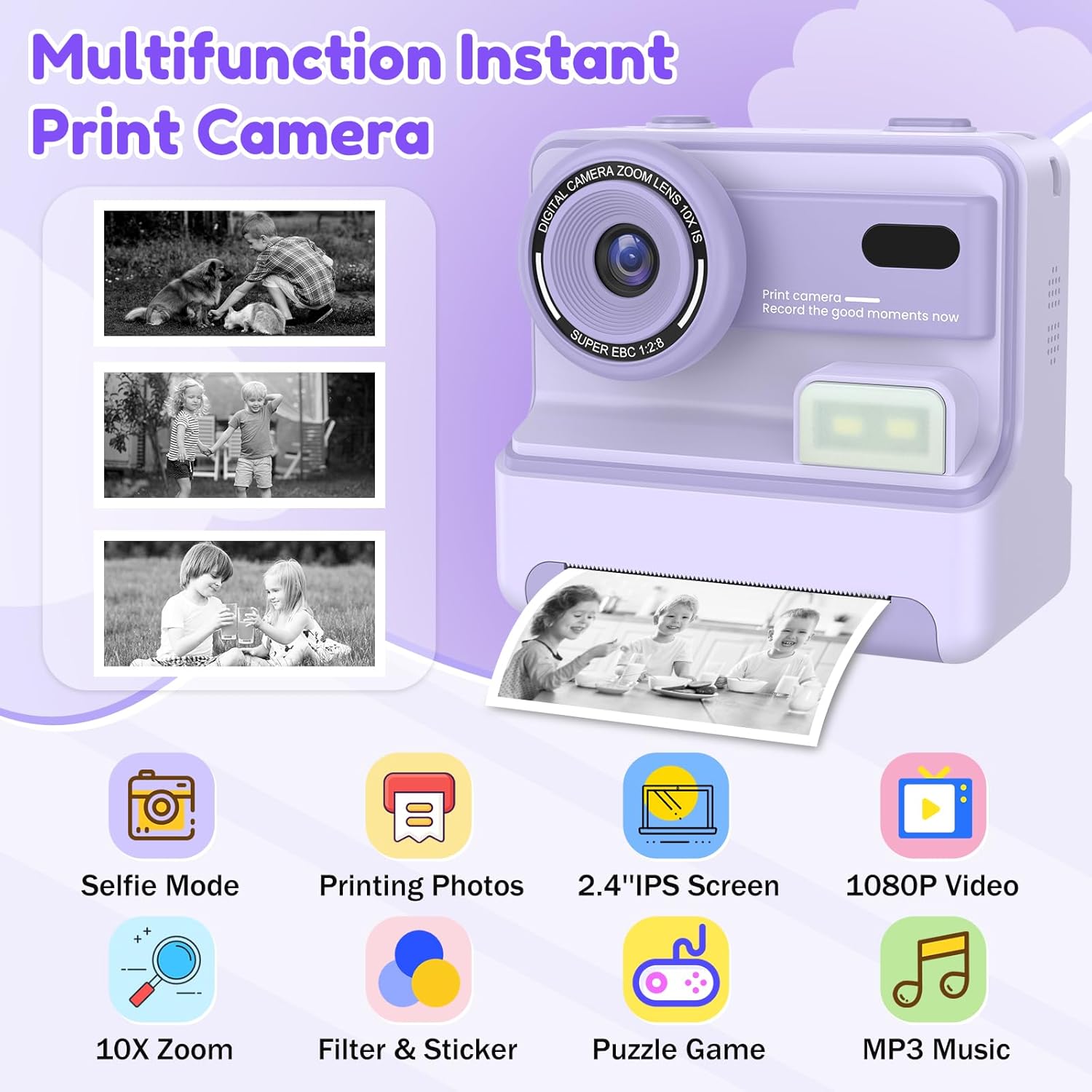 - Multifunctional Kids Digital Camera: Our instant print camera for kids comes with a 2.4-inch screen, 1080P HD camera, 10x zoom, flash, time-lapse mode, burst shooting, an MP3 player, and 3 simple games.