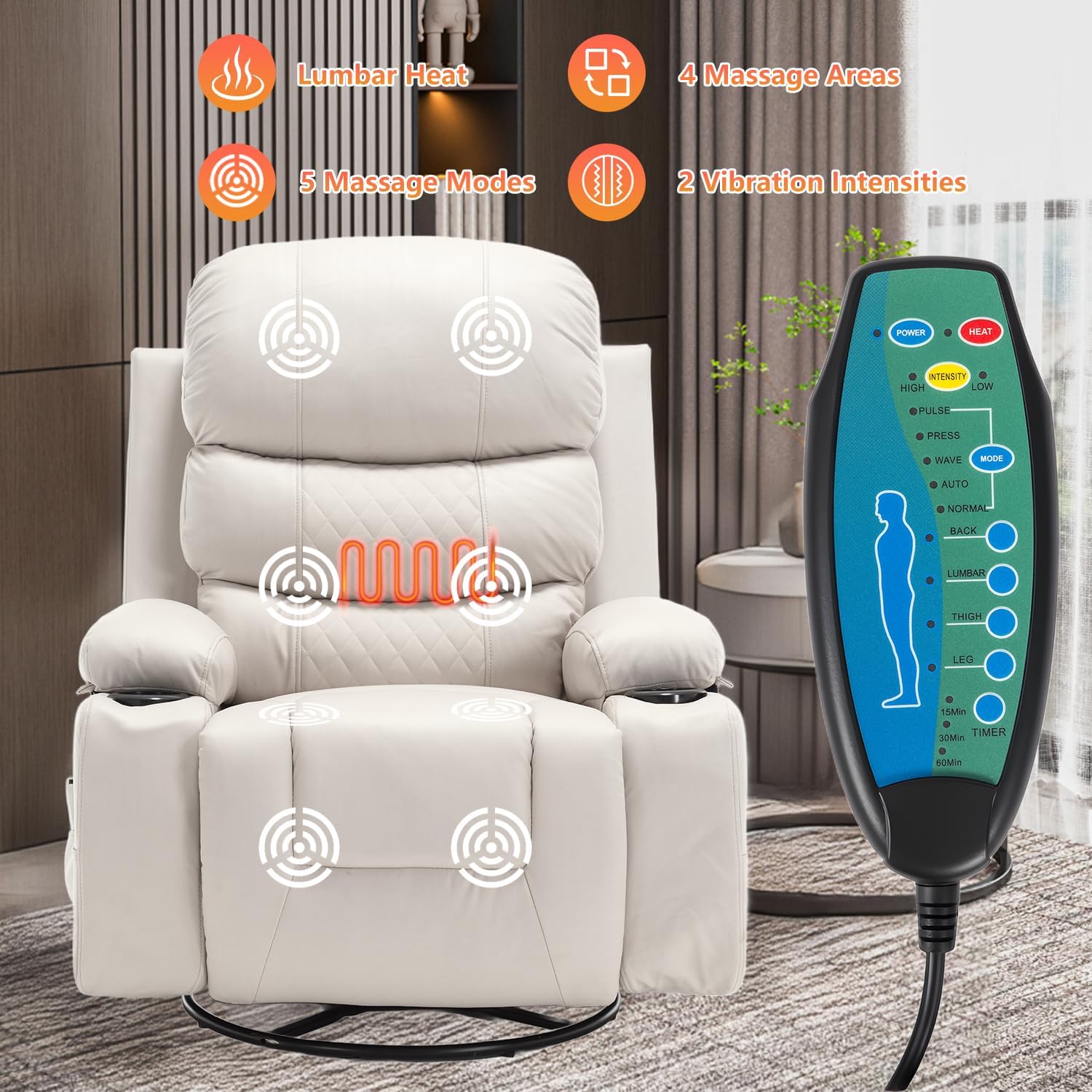 KCQ Massage Swivel Rocker Recliner Chairs with Heat Cup Holders Faux Leather Overstuffed Manual Reclining Chair Rocking Glider Chair for Adults, Beige