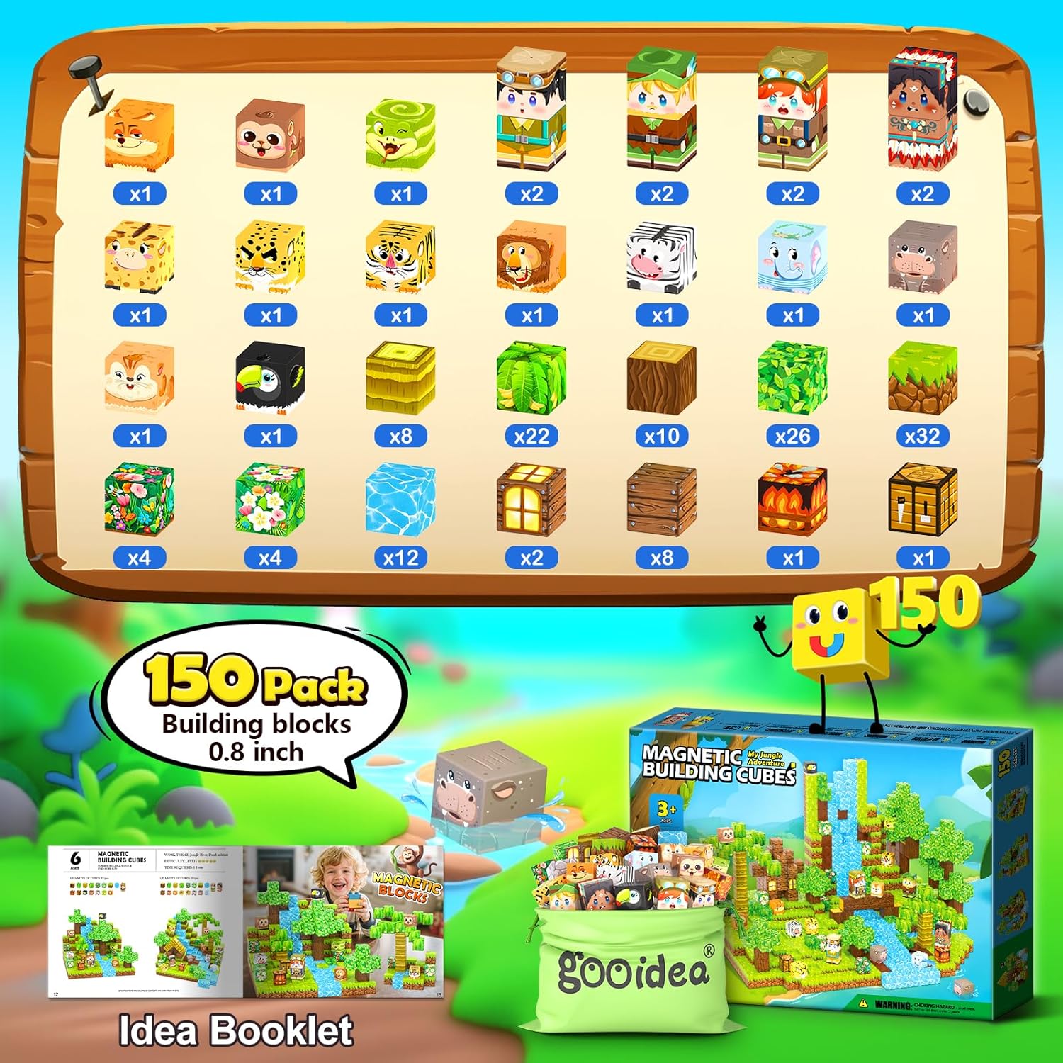 150 Magnetic Blocks – Mine Magnet Game Building Craft, STEM Constructions Toy, Jungle Animals, Sensory Stacking Cubes Kids Toys, Christmas Birthday Gifts for Boys Girls Age 3-5, 5-7, 4-8, 8-12