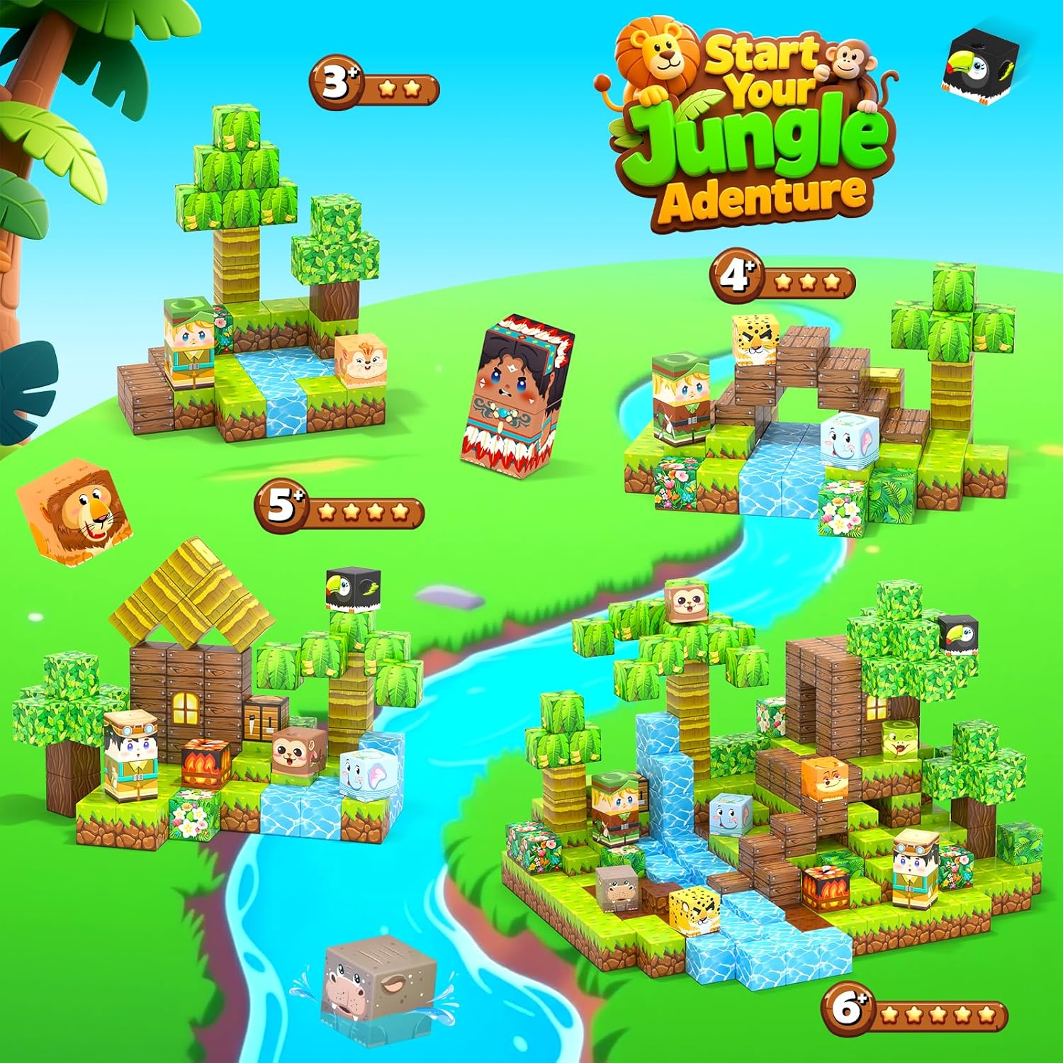 - 【Learn, Build, Take Anywhere】The magnetic building block set is an excellent outdoor toy for boys and girls aged 3-6, 5-7, 4-8, 8-12, and even teenagers will love it! It comes with a jungle adventure guide to assist, and a storage bag for easy carrying and cleanup, making it an ideal travel toy. Perfect for creative educational activities in preschool and kindergarten classrooms, so these magnetic cubes are excellent classroom must have tool. The open-ended play set allows children to unleash their imagination, fun building blocks make screen-free time highly appealing