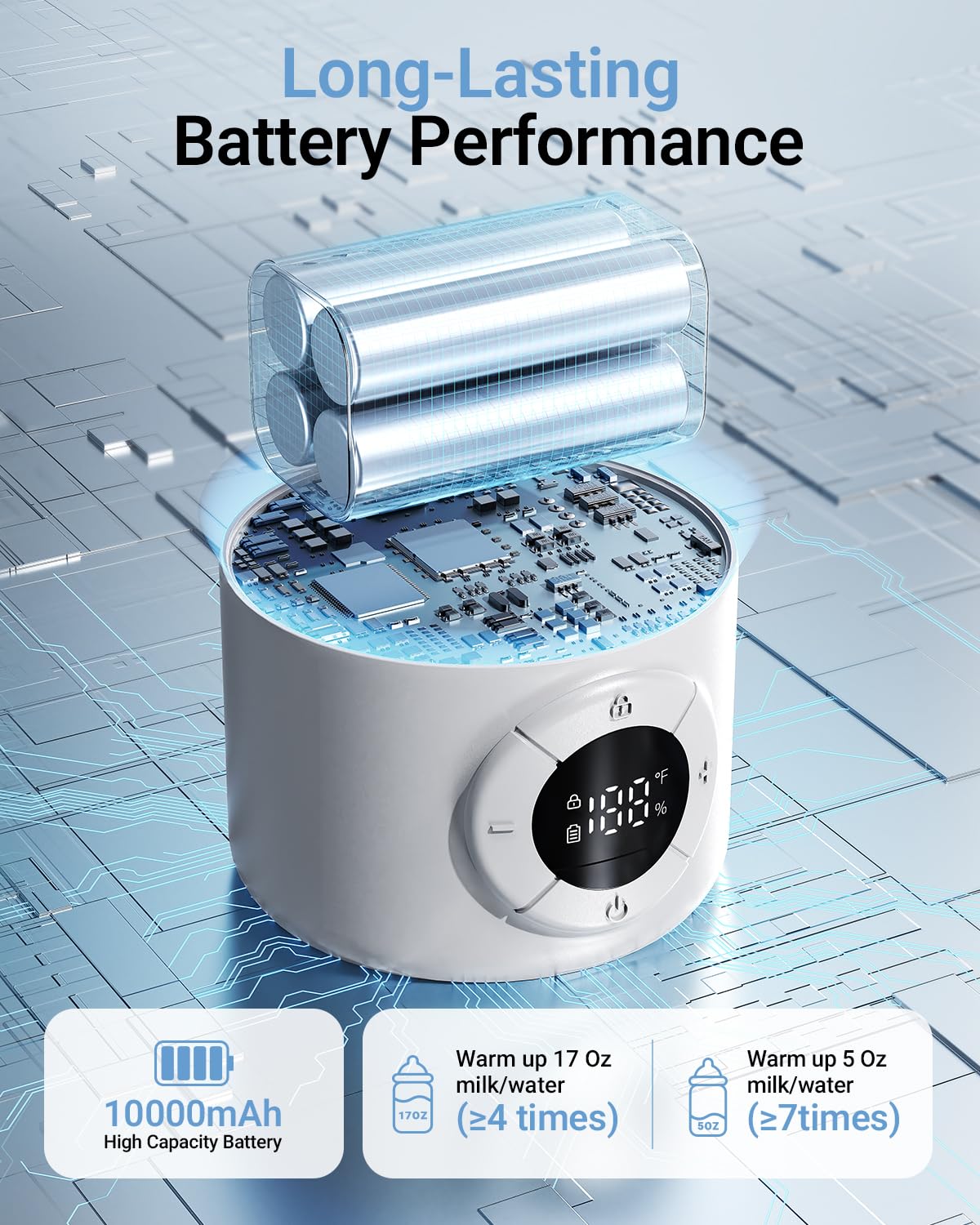 - 【Fast Charging & Long Battery Life】Under 18W fast charging condition, it can be fully charged to 100% in 2 hours or 80% in 1.5 hours. With 10000mAh battery, when battery is 100%, the water warmer for baby formula can support warming up 5 oz water/milk from 77°F to 104°F up to 7 times. Perfect for all-day feeding