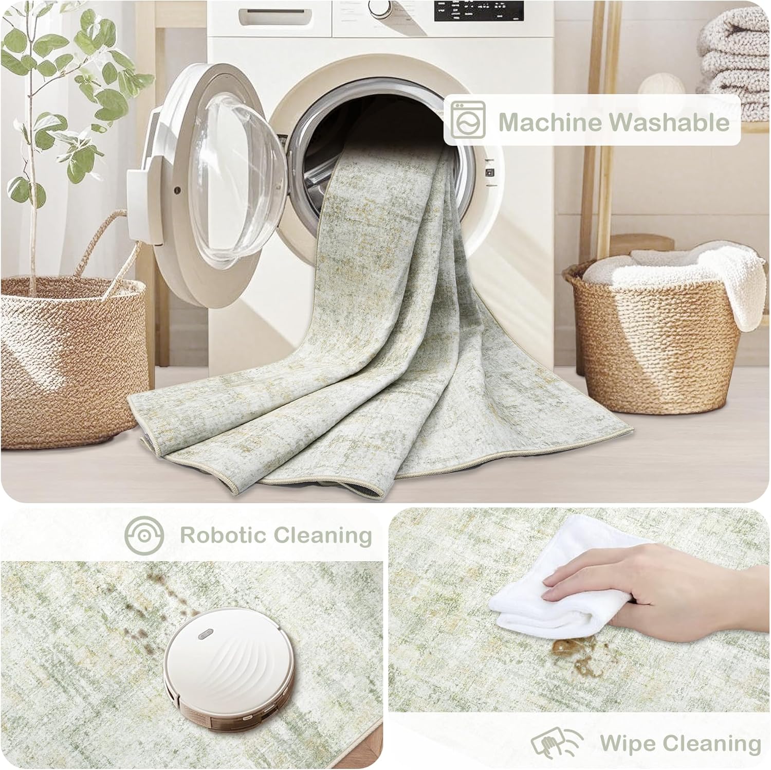 - Anti-Stain Low Pile Rug: Our washable rugs surface pile are short and dense, can block dust and hair embedded, spilled drinks coffee and other liquids will not penetrate into the neutral rug inside; Our 6'x9' large rug is moderately thick and won't snag on doors, which not only keeps indoor rugs clean, but also adds convenience for high traffic areas.