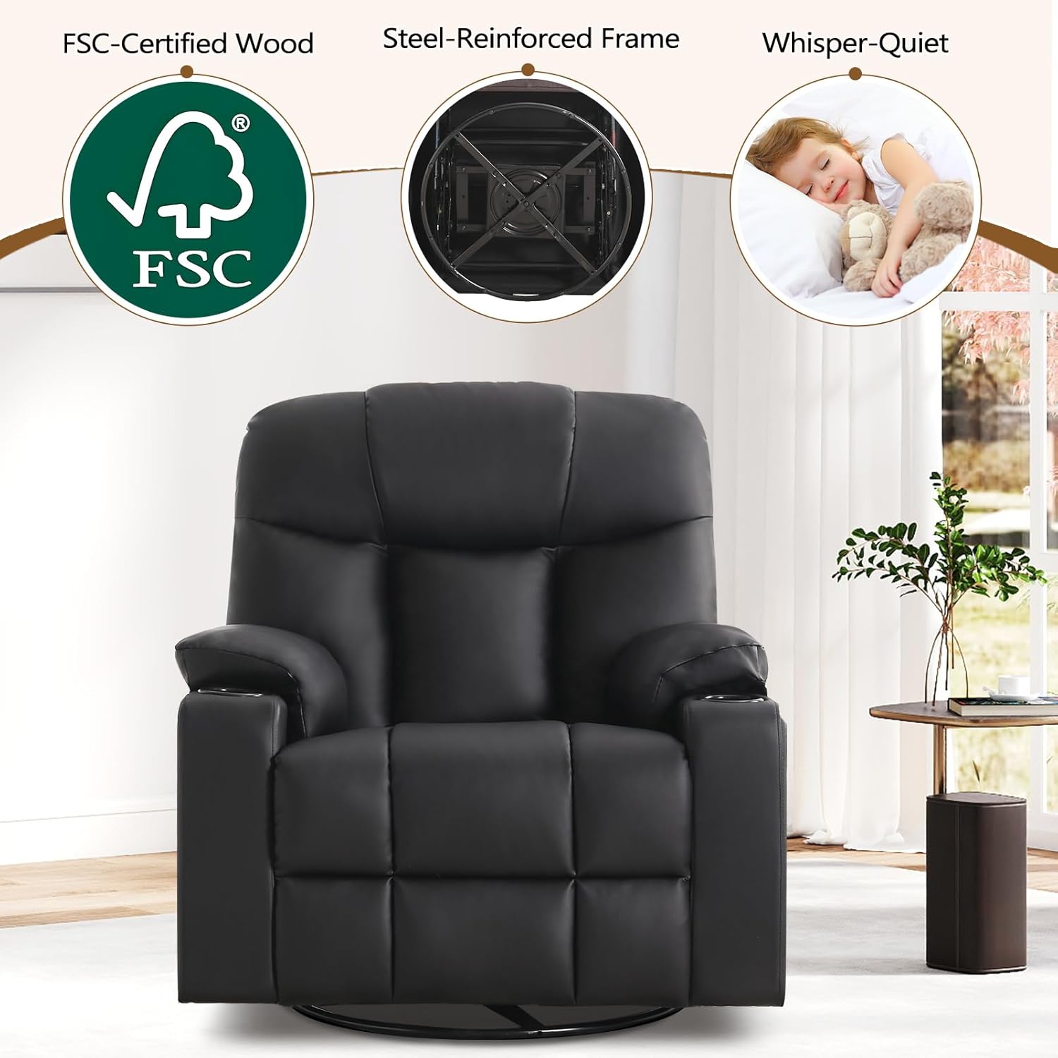 ANJ PU Leather Nursery Recliner Chair, 360° Swivel Rocker with Heat & Massage, 3-Position Manual Reclining for Living Room, Black