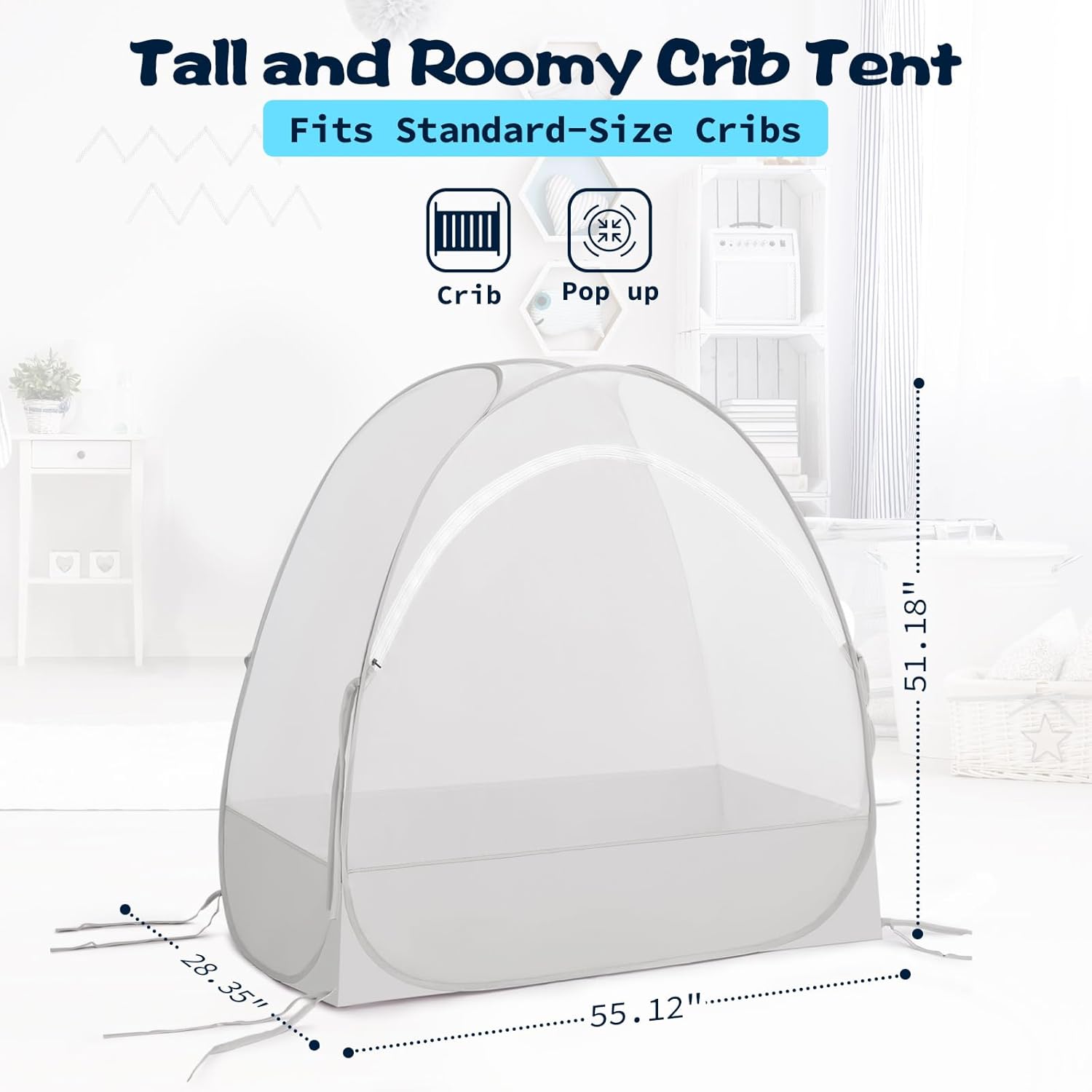 - Keeps Child in -55.12" x 51.18" x 28.35", this Crib safety net tent is designed to fit a Crib bed to keep your toddler safe from climbing out and falling, with this high quality see through mesh tent , you will no more have sleepless nights of worry, as your toddler will be safe in their nursery, this High end quality safety tent will keep them back from climbing out and falling