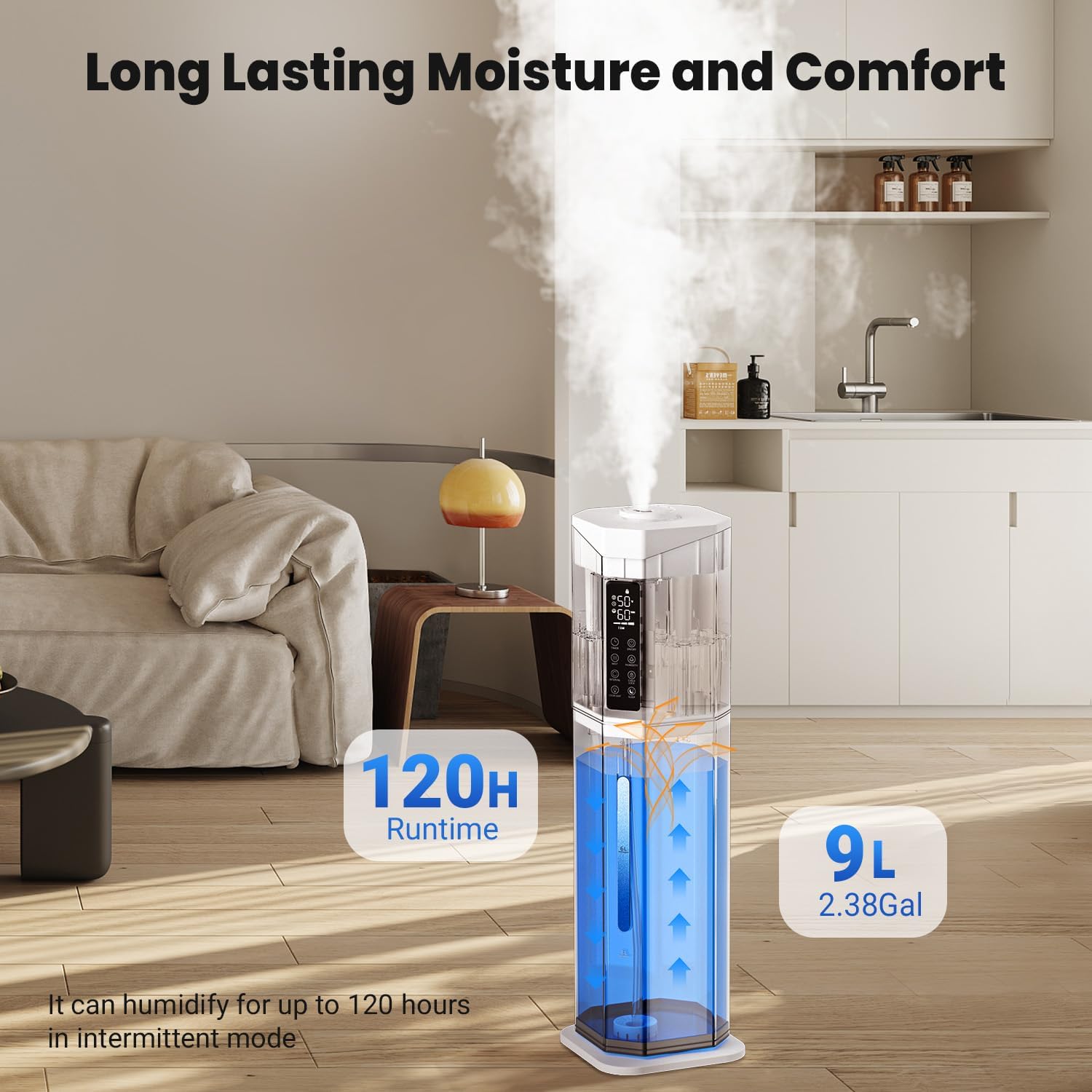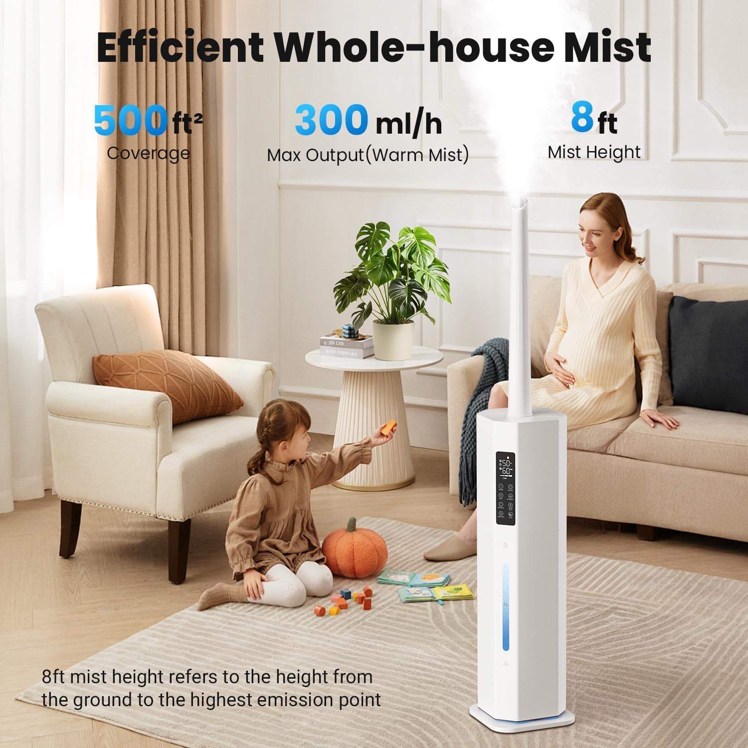 - 𝑺𝒎𝒂𝒓𝒕 𝑯𝒖𝒎𝒊𝒅𝒊𝒕𝒚 𝑪𝒐𝒏𝒕𝒓𝒐𝒍 & 𝑺𝒖𝒓𝒇𝒂𝒄𝒆-𝑺𝒂𝒇𝒆 𝑫𝒆𝒔𝒊𝒈𝒏: With the built-in humidistat, you’re able to set your ideal humidity (45%–95%) in one tap. The HUMIDITY mode maintains your target level and shuts off automatically. The 18-inch extension tube + 360° nozzle ensure a 8-feet mist prevent surface dampness—keeping floors and furniture protected